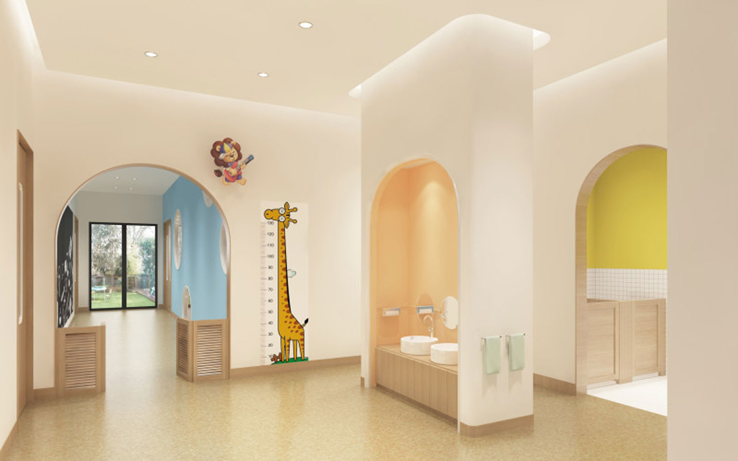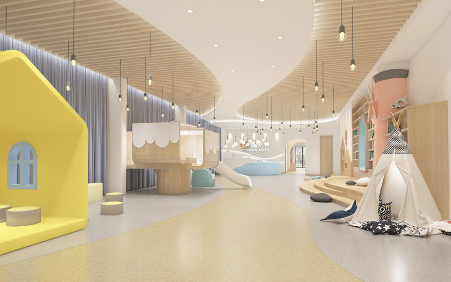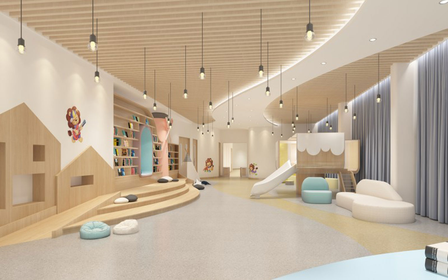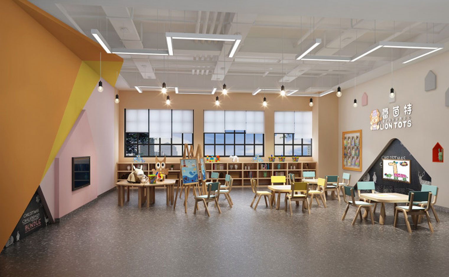 本案以中心案例作為旨在開發(fā)孩童的想象力和創(chuàng)造力的地方,其室內(nèi)裝修設(shè)計(jì)不同于傳統(tǒng)美術(shù)教育空間,熱情濃烈的色彩,像一把能夠開啟幼兒全方位潛能的鑰匙,幫助每個(gè)孩子創(chuàng)造出自己的獨(dú)特。