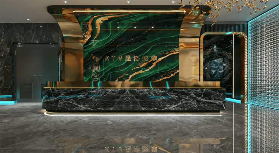 前臺區(qū)域,以黑色大理石搭配金色弧形裝飾,背景墻的綠色紋理石材與金色線條相得益彰,彰顯高端品質。大廳中,大型影視屏幕與綠植點綴,營造舒適氛圍。
