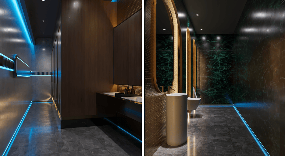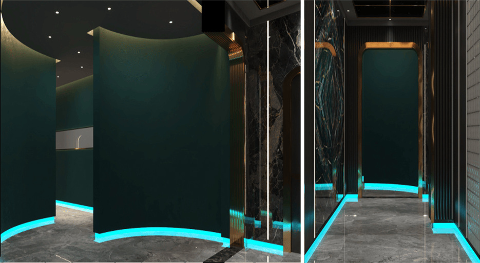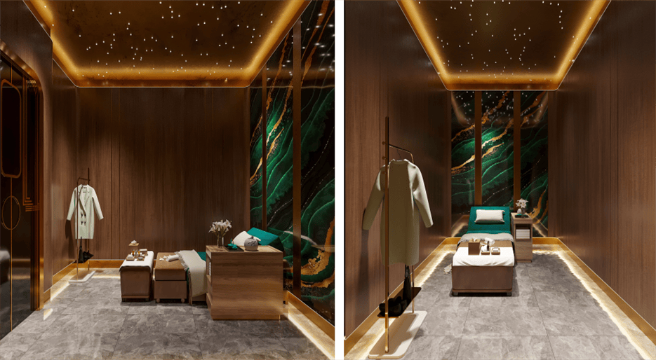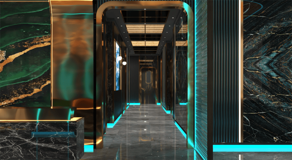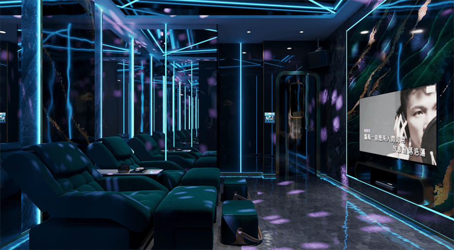 走廊及包間,深色大理石地面搭配藍色燈帶,營造出神秘且時尚的氛圍。包間內(nèi),木質墻板搭配綠色石材背景墻,溫馨舒適,星空頂設計增添浪漫情調(diào)。KTV 包間,藍色霓虹燈帶與鏡面材質結合,打造出炫酷的視聽空間,舒適的沙發(fā)座椅提升顧客體驗,整體設計旨在為顧客提供一個集休閑、娛樂、放松于一體的高品質場所。