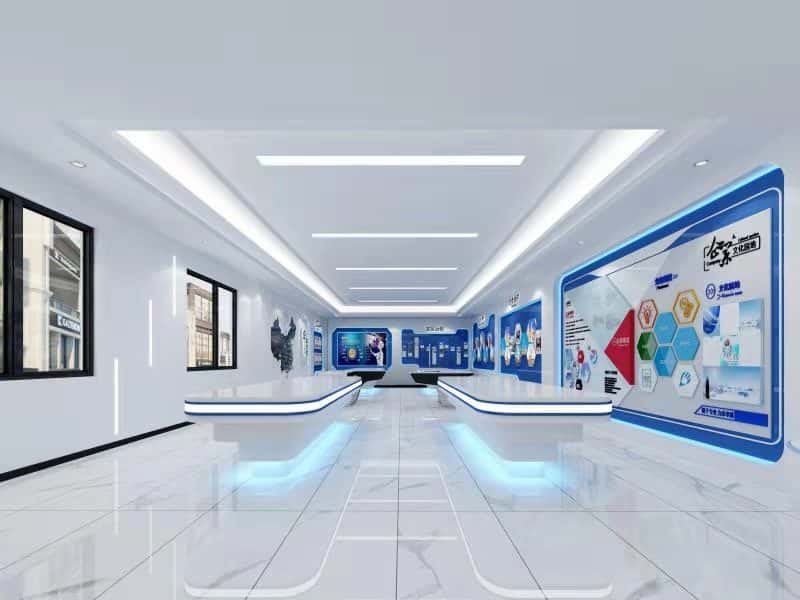 展廳,藍白配色凸顯科技感,墻面展板結(jié)合多媒體設(shè)備,全面展示企業(yè)信息,展示臺造型新穎,燈光烘托氛圍,打造出一個充滿科技與未來感的展示空間。