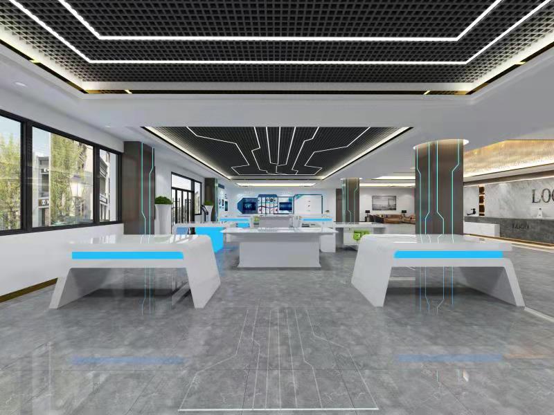展廳,藍(lán)白配色凸顯科技感,獨(dú)特的天花板造型與地面線條相呼應(yīng),展示臺(tái)造型新穎,結(jié)合多媒體設(shè)備,全方位展示企業(yè)信息。