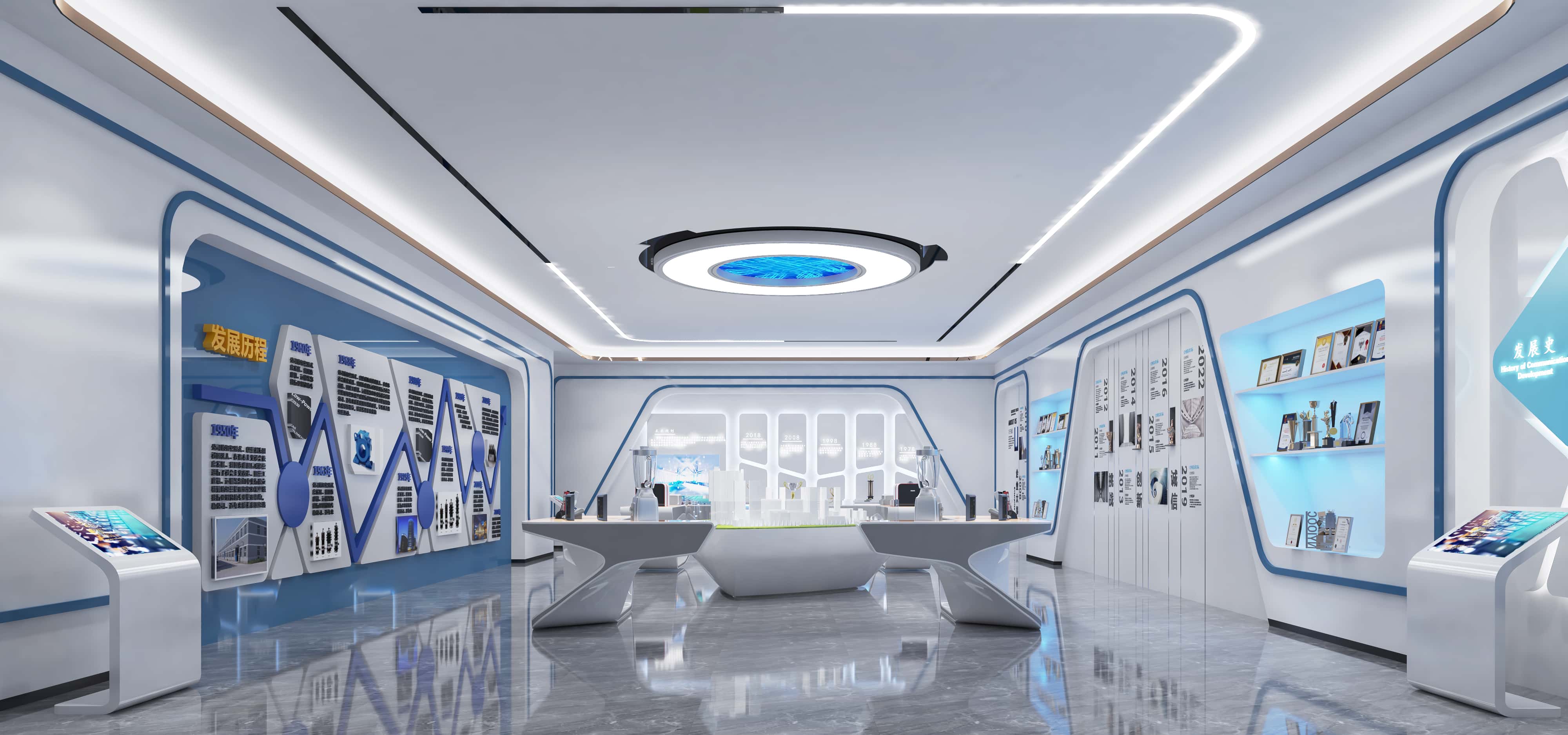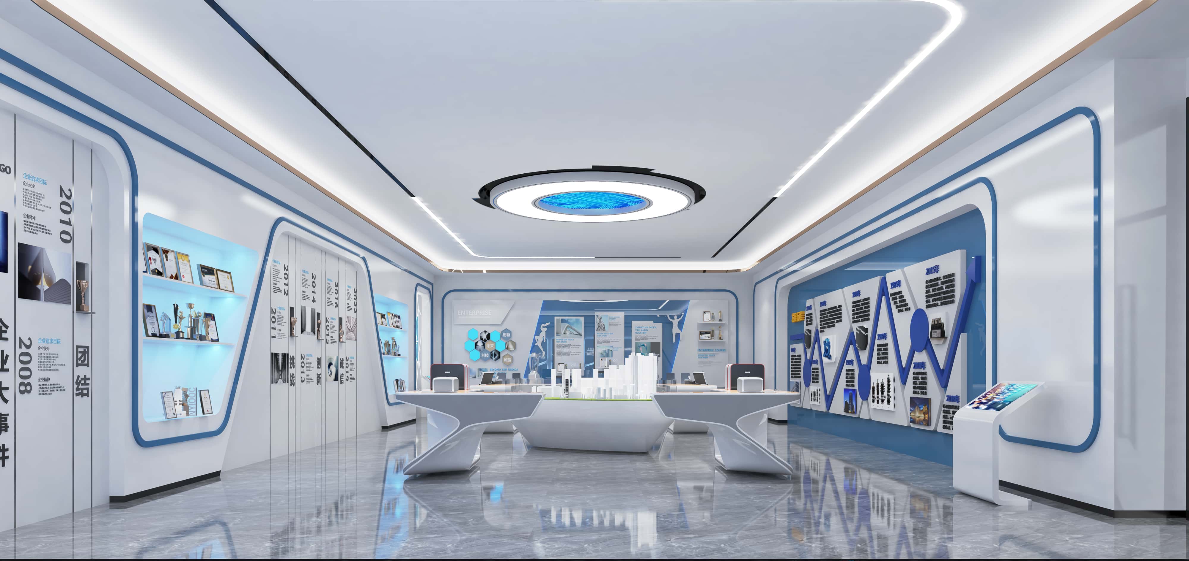 展廳區(qū)域,藍白配色凸顯科技感,弧形墻面結合燈帶,造型獨特。展示墻系統(tǒng)呈現(xiàn)企業(yè)歷程與榮譽,多媒體設備增強互動,展示臺設計新穎,燈光烘托氛圍,打造出一個集展示與體驗于一體的現(xiàn)代空間。