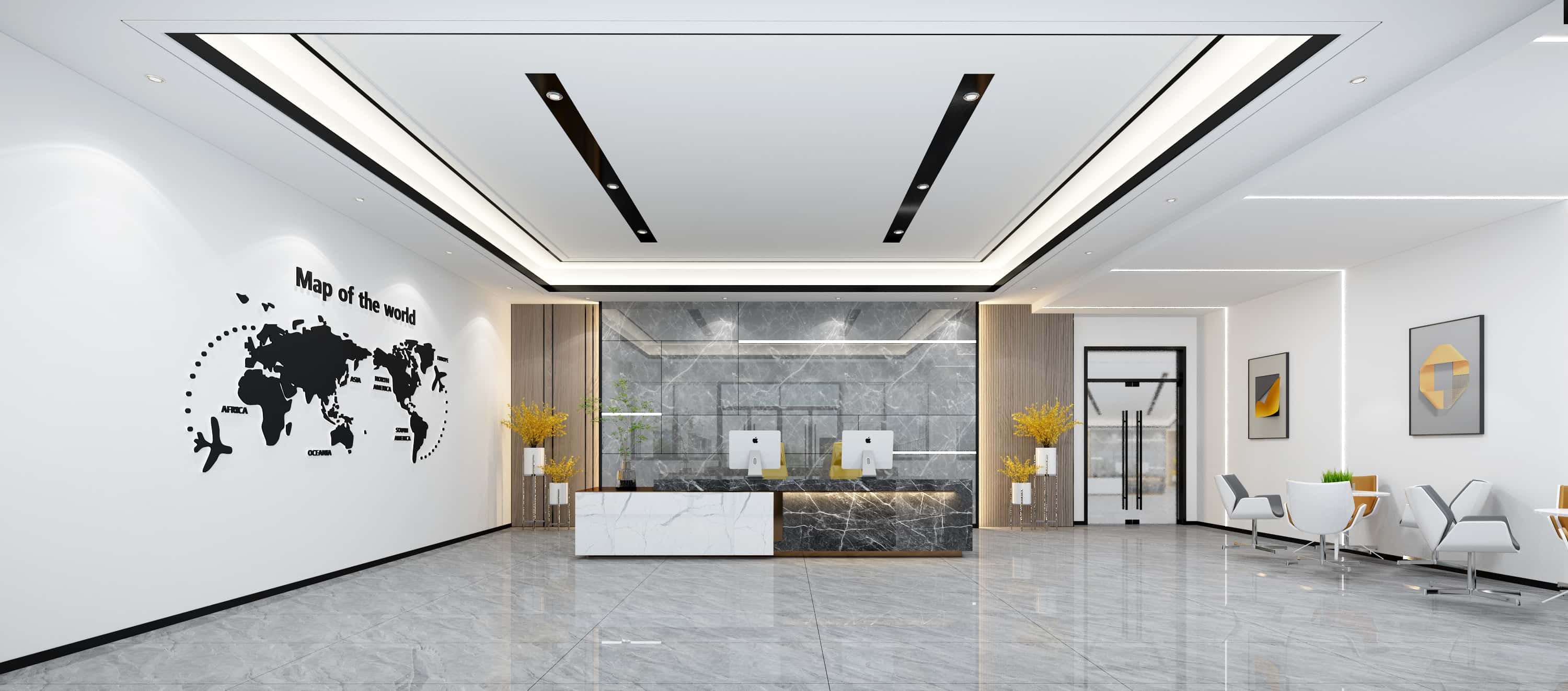 前臺(tái)區(qū)域,以白色為主調(diào),搭配世界地圖墻貼,彰顯國際化視野,大理石前臺(tái)與木質(zhì)元素結(jié)合,增添質(zhì)感與溫馨。