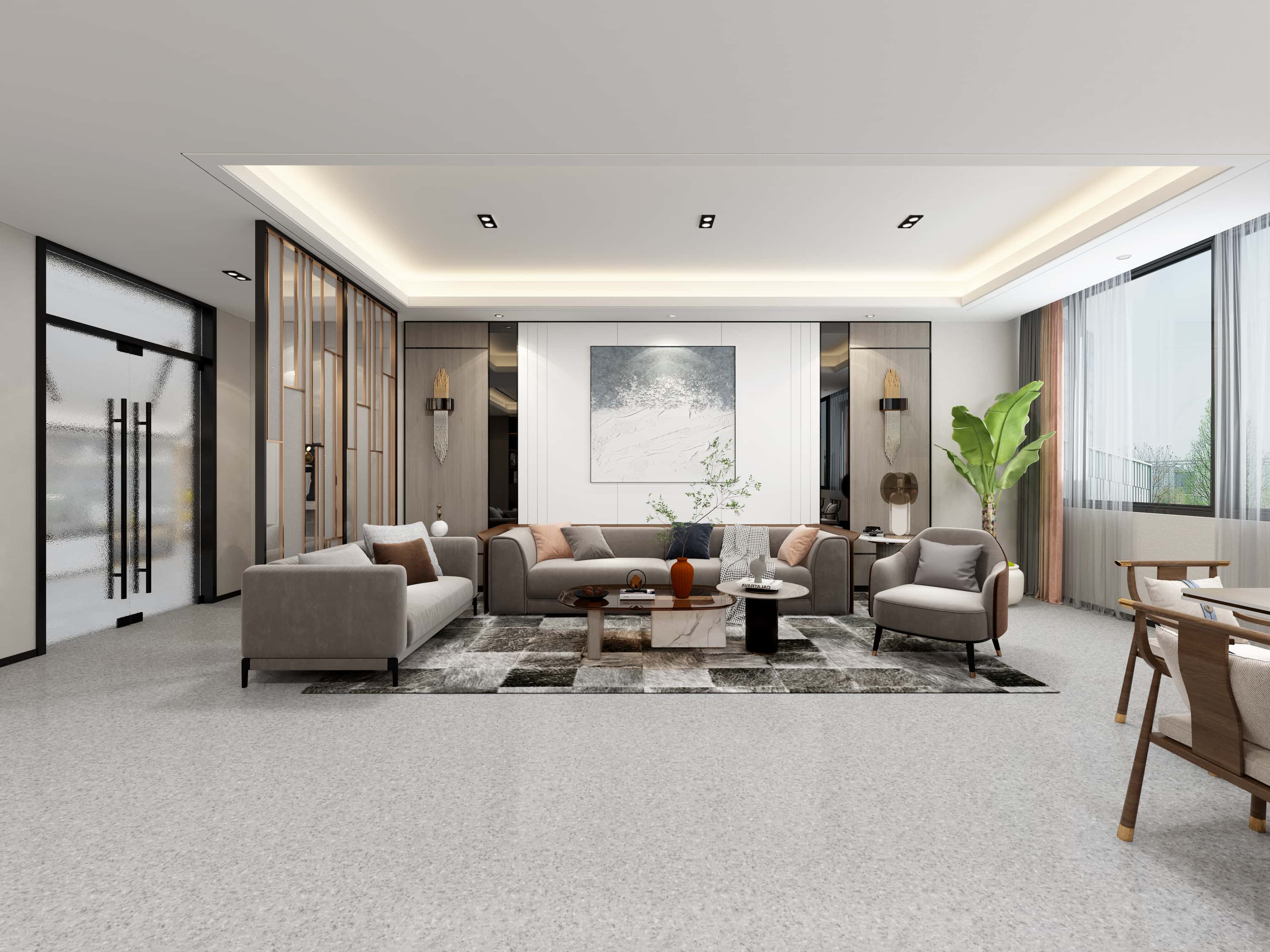 接待室,淺灰地毯搭配柔和燈光,營造舒適氛圍,沙發(fā)、茶幾等家具擺放錯(cuò)落有致,藝術(shù)畫作提升空間格調(diào)。