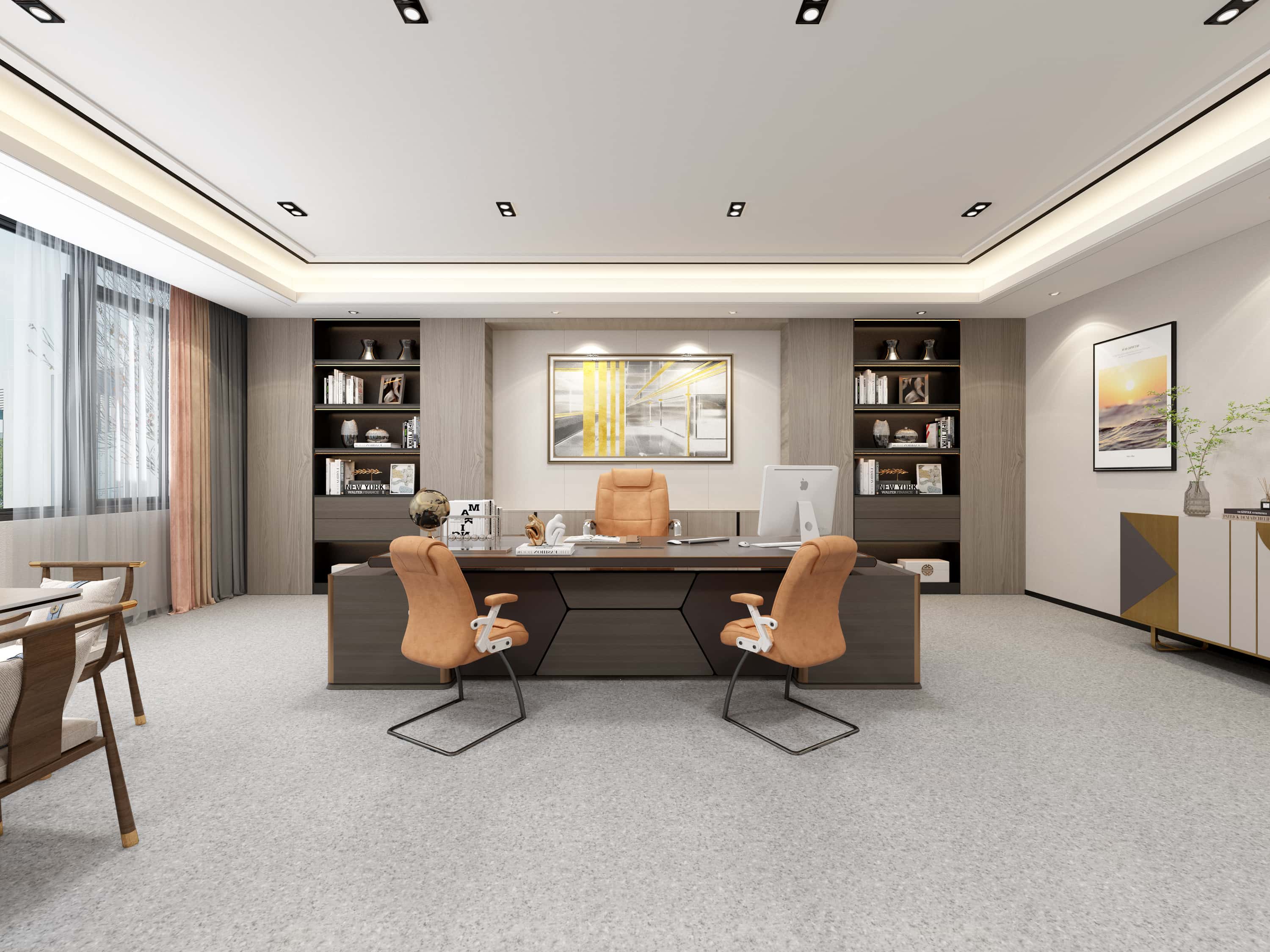 經(jīng)理辦公室,布局合理,辦公桌椅與書架搭配協(xié)調(diào),裝飾畫與綠植點(diǎn)綴其間,營造出專業(yè)且舒適的辦公環(huán)境。