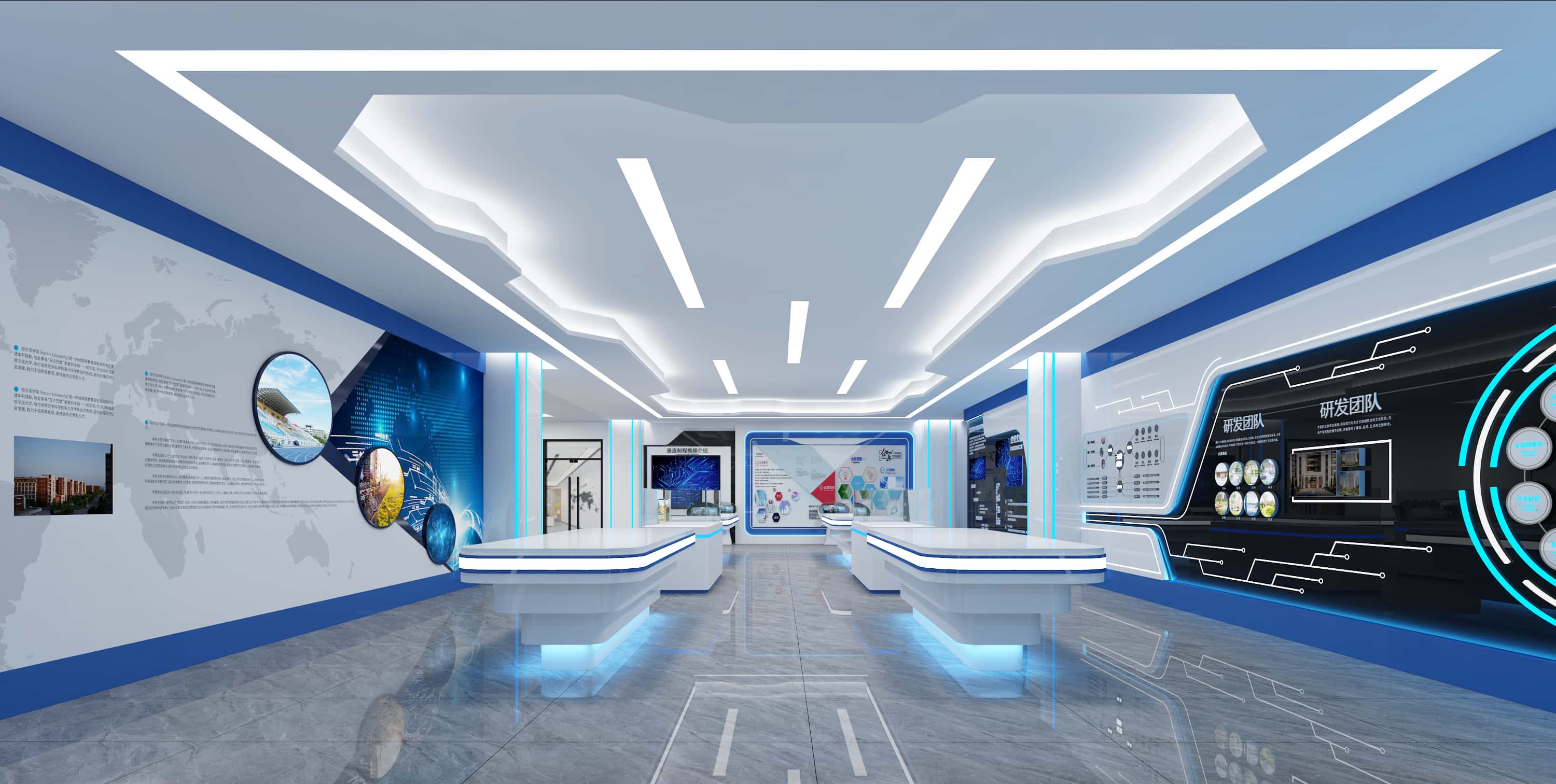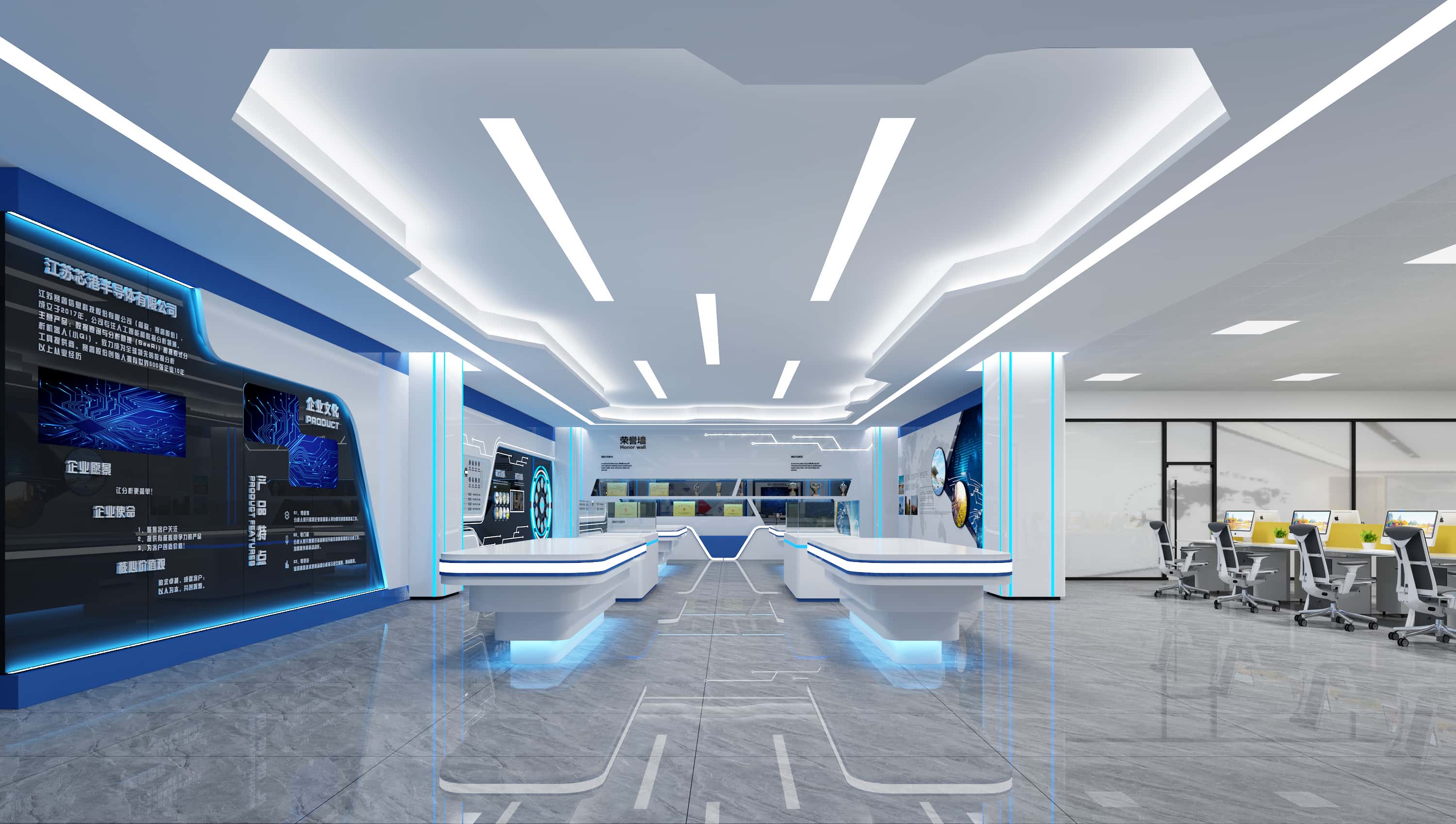 展廳區(qū)域,藍(lán)白配色凸顯科技感,墻面展板結(jié)合多媒體設(shè)備,全面展示企業(yè)信息,展示臺(tái)造型獨(dú)特,燈光設(shè)計(jì)增強(qiáng)空間立體感,打造出一個(gè)充滿科技與未來感的展示空間。