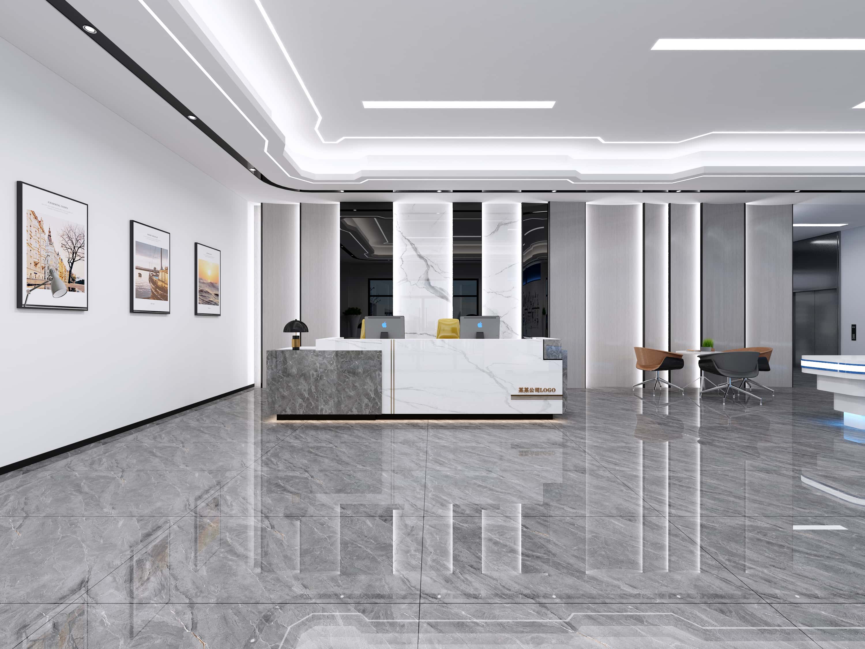 前臺區(qū)域,以白色為主調(diào),搭配大理石材質(zhì),簡潔大氣。墻面掛畫增添藝術(shù)氛圍,燈光設(shè)計增強空間層次感。