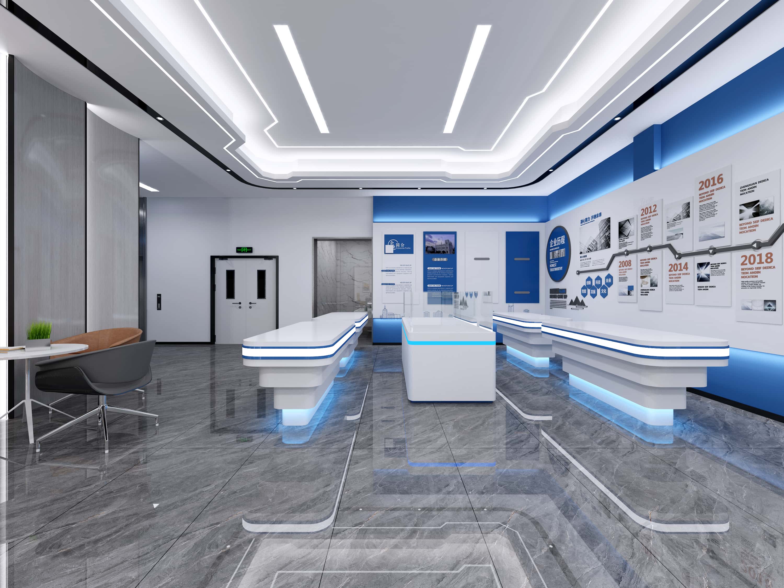 展廳區(qū)域,藍白配色凸顯科技感,展示臺造型新穎,墻面展板系統(tǒng)展示企業(yè)歷程與信息,燈光烘托氛圍,打造出一個集展示與體驗于一體的現(xiàn)代空間。
