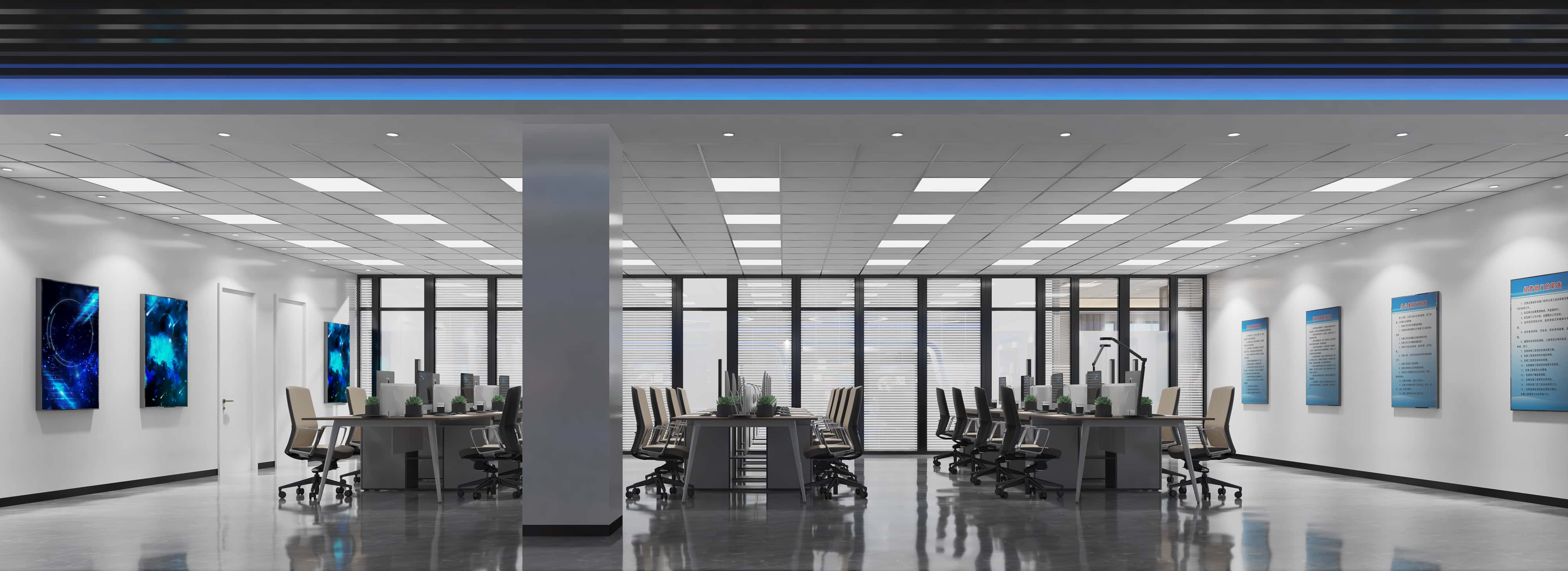 辦公區(qū),空間寬敞明亮,白色墻面與灰色地面搭配協(xié)調(diào),大面積窗戶引入自然光,搭配百葉窗可調(diào)節(jié)光線,墻上的科技主題畫作與規(guī)章制度展板相得益彰,營造出專業(yè)高效的工作環(huán)境。