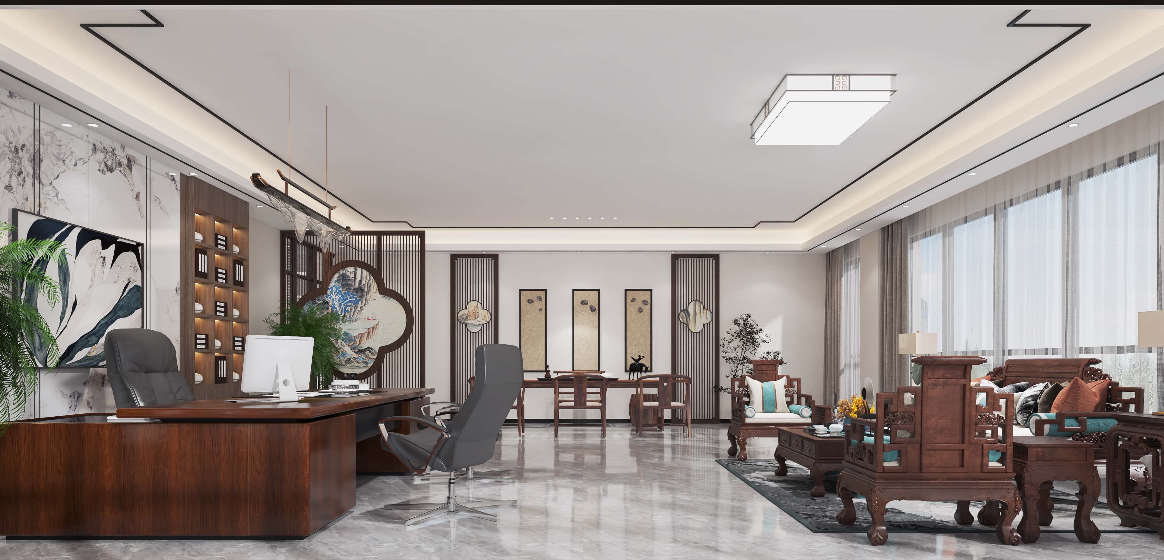 經(jīng)理辦公室,新中式風(fēng)格盡顯典雅,木質(zhì)家具古樸大氣,搭配中式屏風(fēng)、掛畫等裝飾,營造出寧靜雅致的辦公氛圍,同時滿足辦公與接待需求。