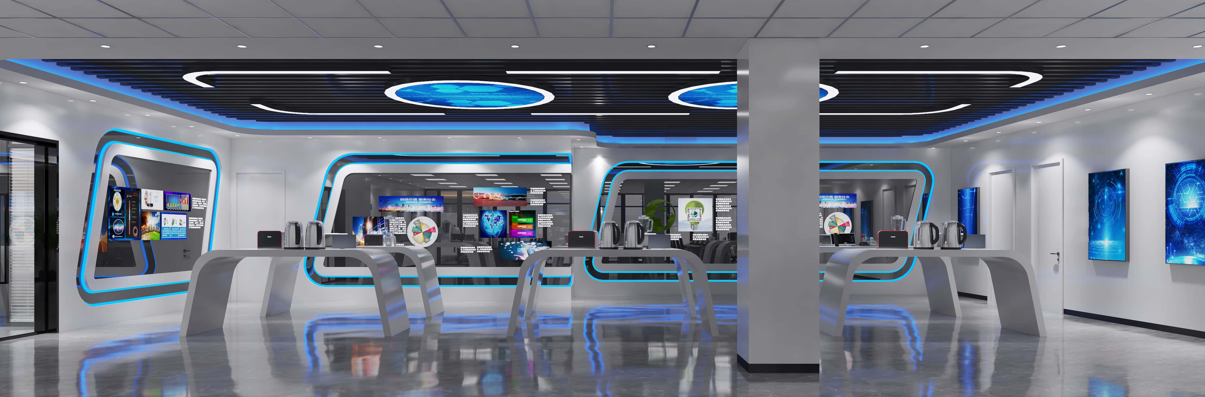 展廳,藍白為主色調(diào),造型獨特的展示墻結(jié)合多媒體設(shè)備,天花板的燈光設(shè)計與整體風(fēng)格呼應(yīng),打造出充滿科技感與未來感的展示空間,全方位展示企業(yè)形象與產(chǎn)品。