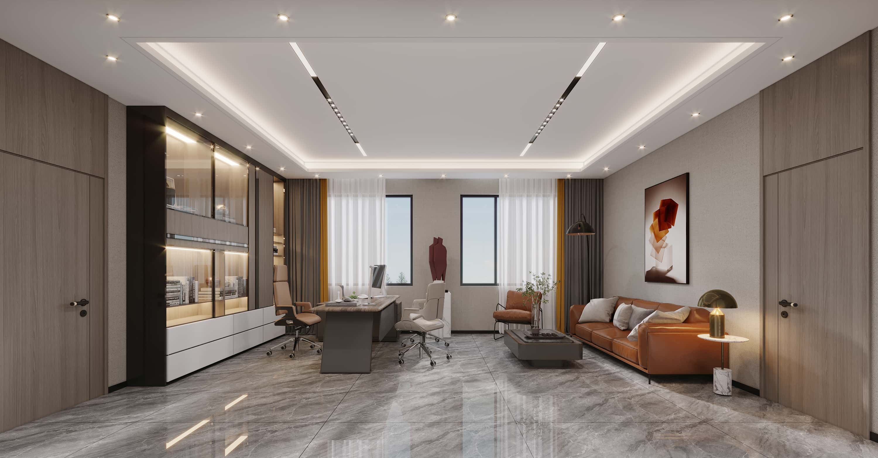 辦公室內(nèi),墻面采用木質(zhì)紋理,營(yíng)造溫馨氛圍。辦公桌椅實(shí)用舒適,沙發(fā)與裝飾畫(huà)點(diǎn)綴其間,提升空間品味。燈光設(shè)計(jì)柔和明亮,滿足辦公需求同時(shí)營(yíng)造舒適環(huán)境。
