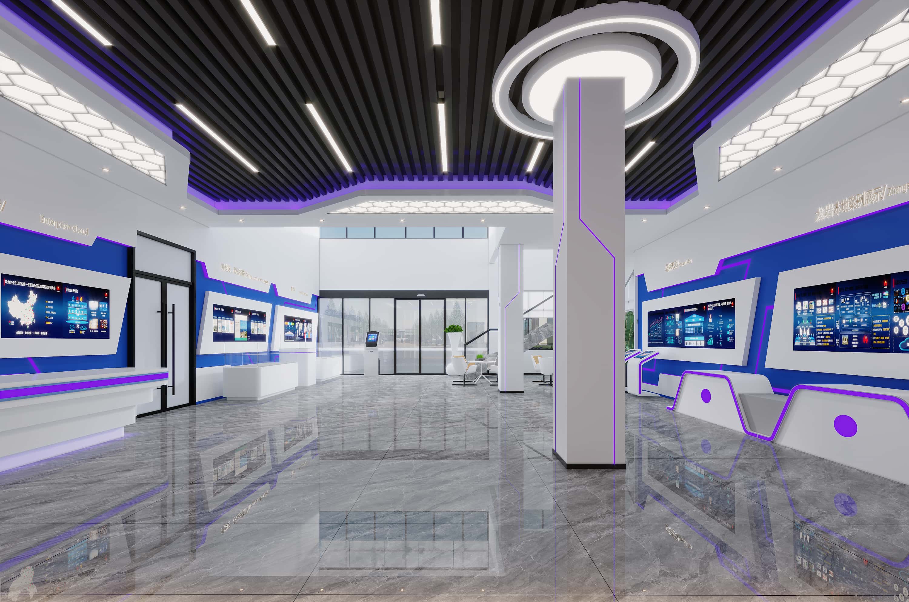 展廳部分,藍(lán)白配色為主調(diào),科技感十足。墻面展示區(qū)結(jié)合多媒體設(shè)備,全方位展示信息。天花板造型獨(dú)特,燈光線條流暢,與地面材質(zhì)相互映襯,打造出一個(gè)集展示與體驗(yàn)于一體的現(xiàn)代空間。
