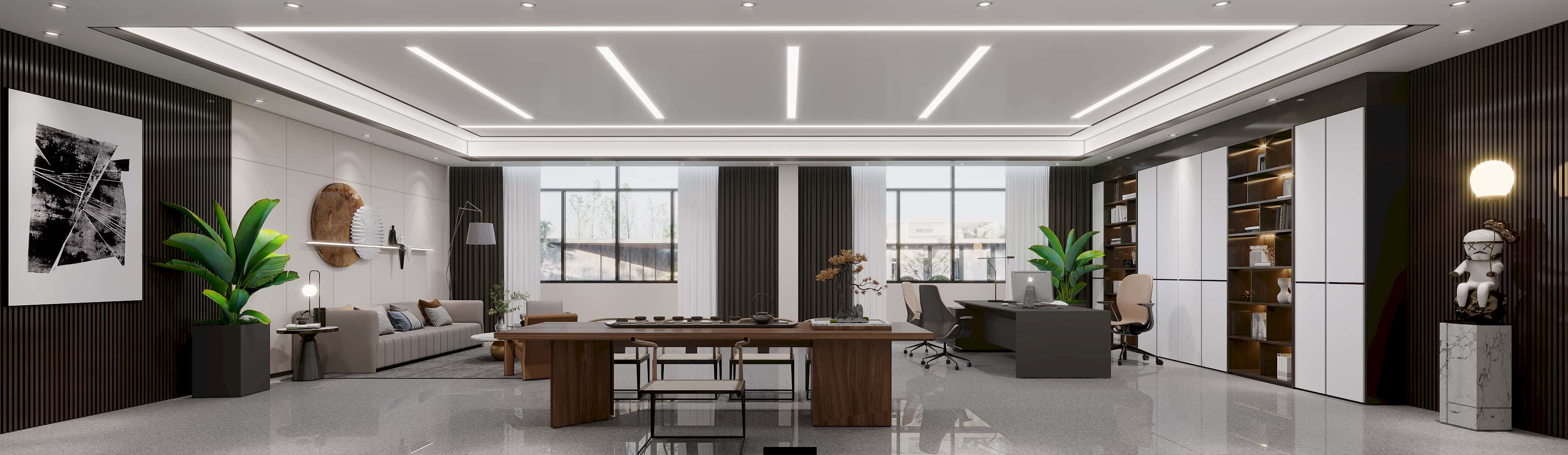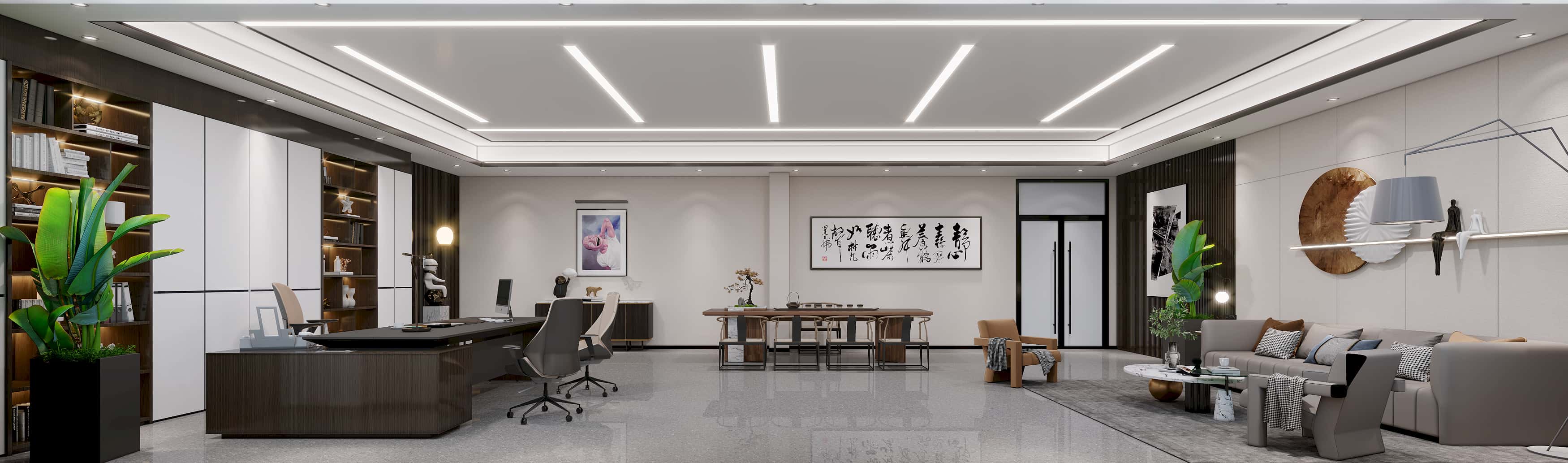 辦公室內(nèi),布局寬敞合理,深色辦公桌與淺色墻面形成對比,書架豐富空間層次,字畫、綠植及藝術(shù)擺件提升文化氛圍與品味。