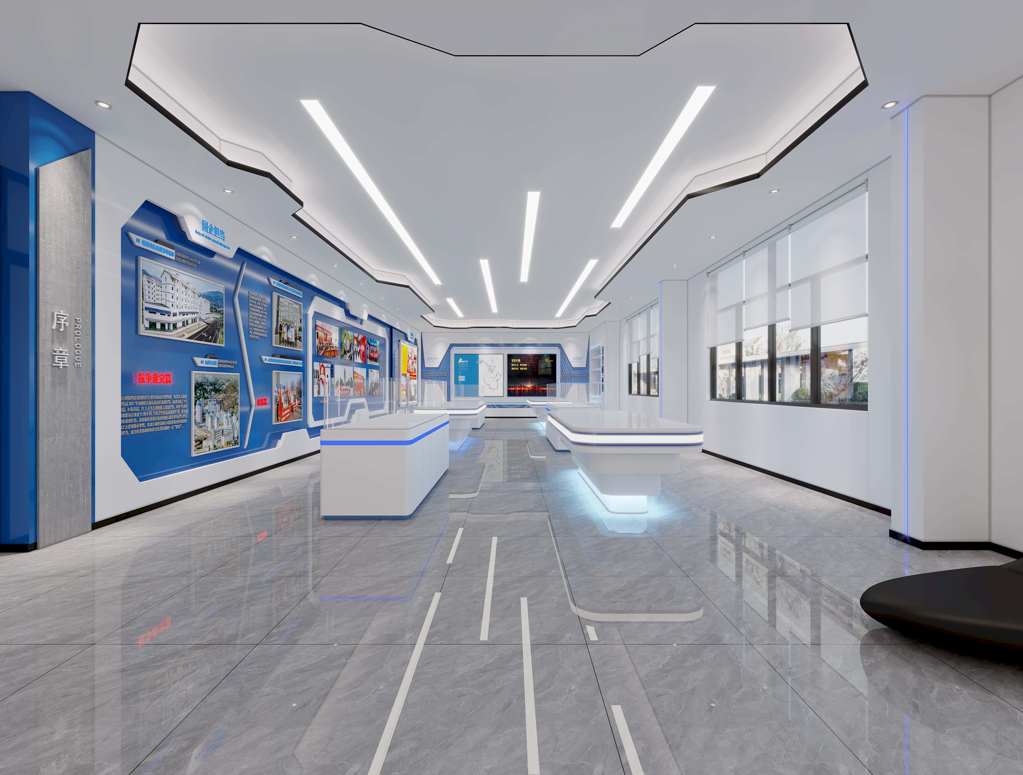 展廳則采用藍(lán)白配色,科技感十足,墻面展示企業(yè)信息,燈光設(shè)計(jì)增強(qiáng)空間立體感與現(xiàn)代感,地面線條引導(dǎo)參觀路線,整體營造出專業(yè)、舒適且富有活力的辦公與展示環(huán)境。