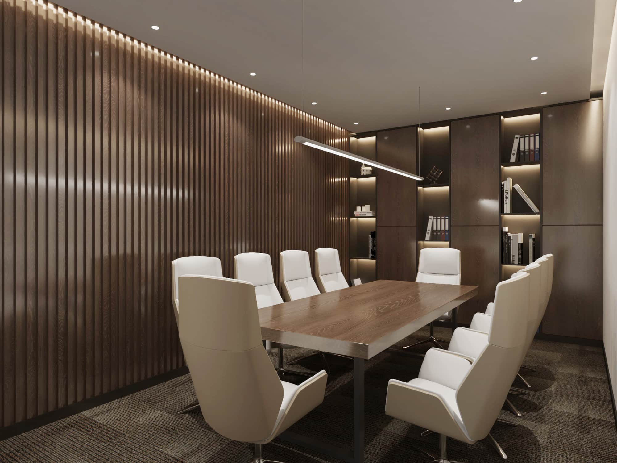 會(huì)議室設(shè)計(jì)注重沉穩(wěn)與專業(yè)。墻面采用深色木質(zhì)豎條紋裝飾,營造出溫暖而莊重的氛圍。內(nèi)嵌式燈帶設(shè)計(jì),既提供了充足的照明,又增強(qiáng)了空間的層次感與立體感。