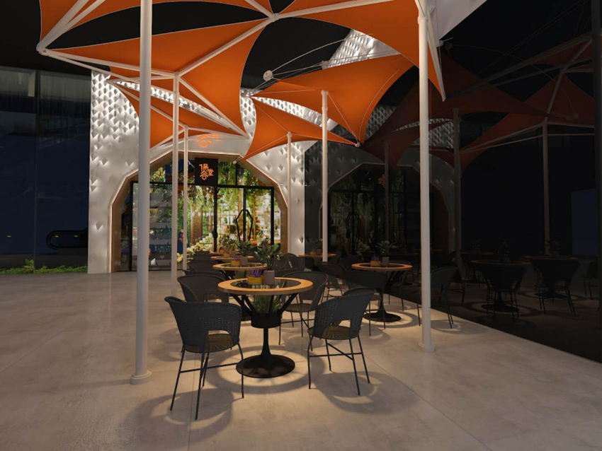 戶外設(shè)置了休閑桌椅,搭配橙色的遮陽(yáng)傘,色彩鮮艷且富有活力,為顧客提供了一個(gè)舒適的戶外休憩空間。地面鋪設(shè)的材質(zhì)看起來簡(jiǎn)潔大方,與整體環(huán)境相協(xié)調(diào),夜晚的燈光設(shè)計(jì)營(yíng)造出溫馨的氛圍,適合朋友小聚或休閑放松。