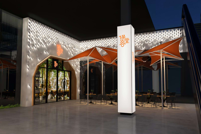 整體建筑外觀極具現(xiàn)代感與辨識(shí)度。白色的外立面搭配獨(dú)特的菱形紋理,在燈光的映襯下,顯得格外醒目且富有質(zhì)感。上方醒目的橙色 “煲谷堂” 字樣,與白色背景形成鮮明對(duì)比,突出品牌名稱,吸引路人目光。