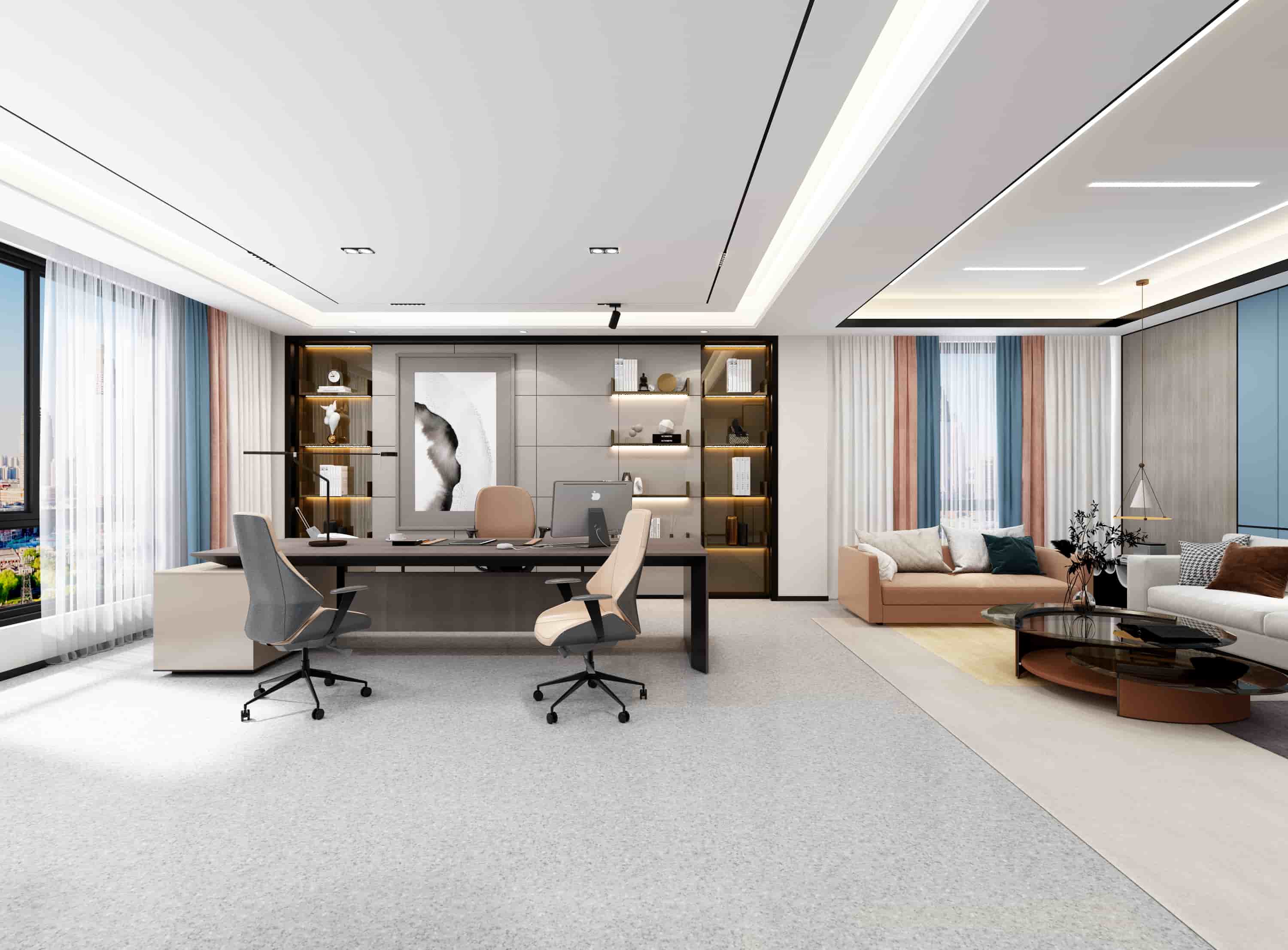 該辦公室延續(xù)了現(xiàn)代簡約的風(fēng)格,色調(diào)以米色、灰色和棕色為主,營造出溫馨舒適的辦公環(huán)境。辦公桌同樣簡約大方,搭配舒適的辦公椅,滿足日常辦公需求。