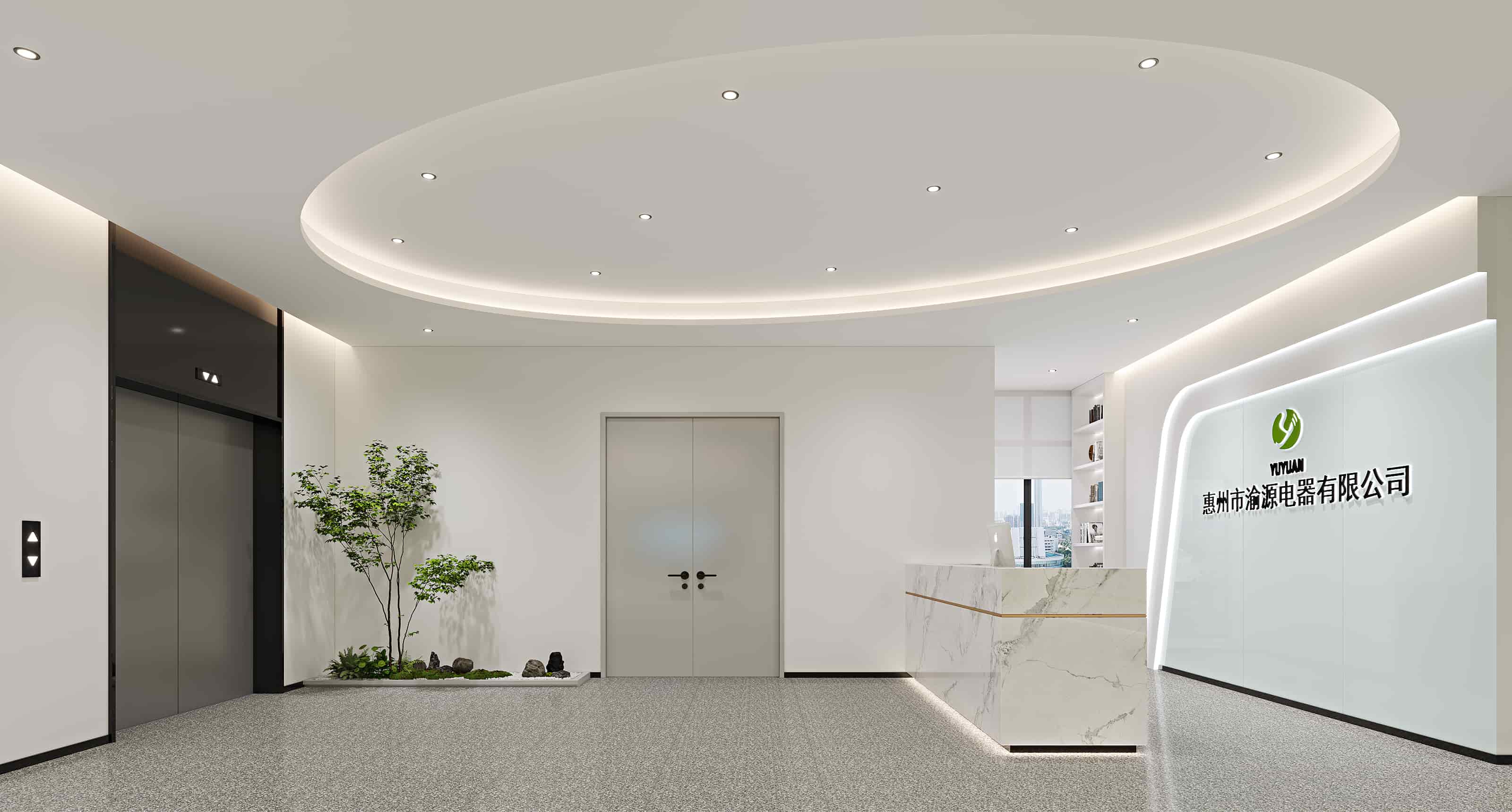 本設(shè)計為惠州市渝源電器有限公司的辦公場所,整體風(fēng)格現(xiàn)代簡約且富有科技感與文化氛圍。