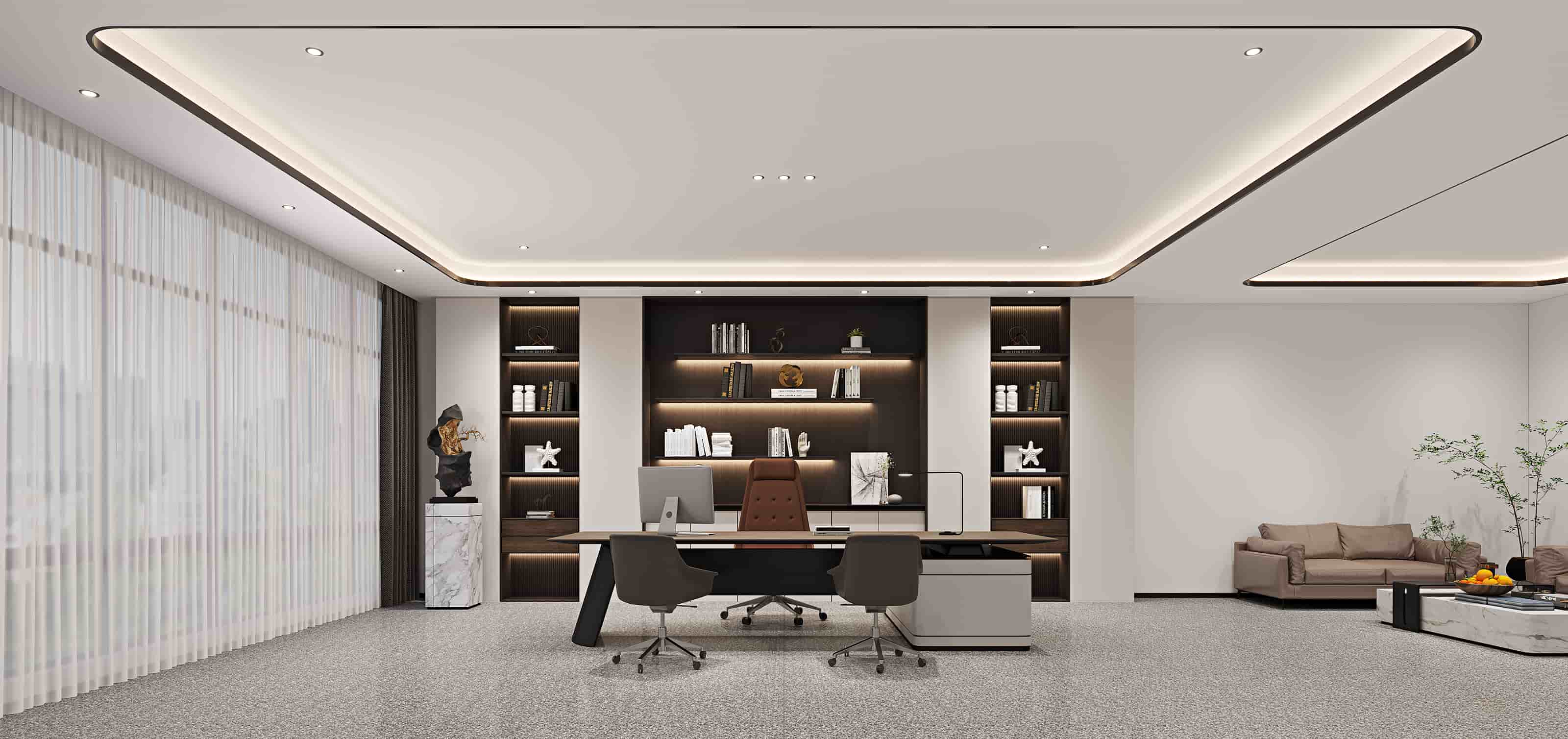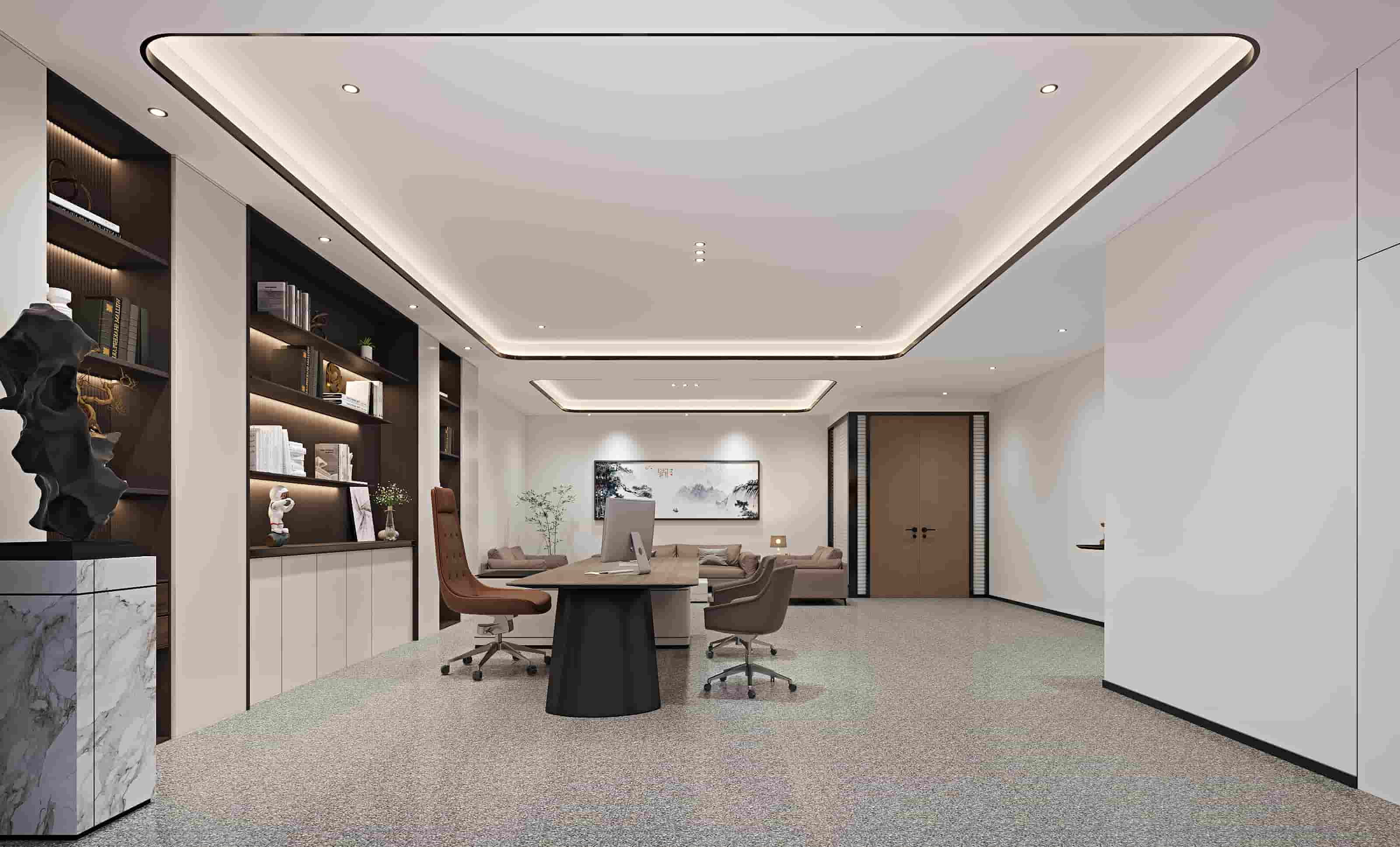 辦公家具選擇簡約大氣的款式,辦公桌、辦公椅及沙發(fā)等家具的顏色搭配和諧,營造出舒適的辦公氛圍。書架上擺放的書籍、裝飾品等,豐富了空間的文化內(nèi)涵,展現(xiàn)出企業(yè)的品味與格調(diào)。