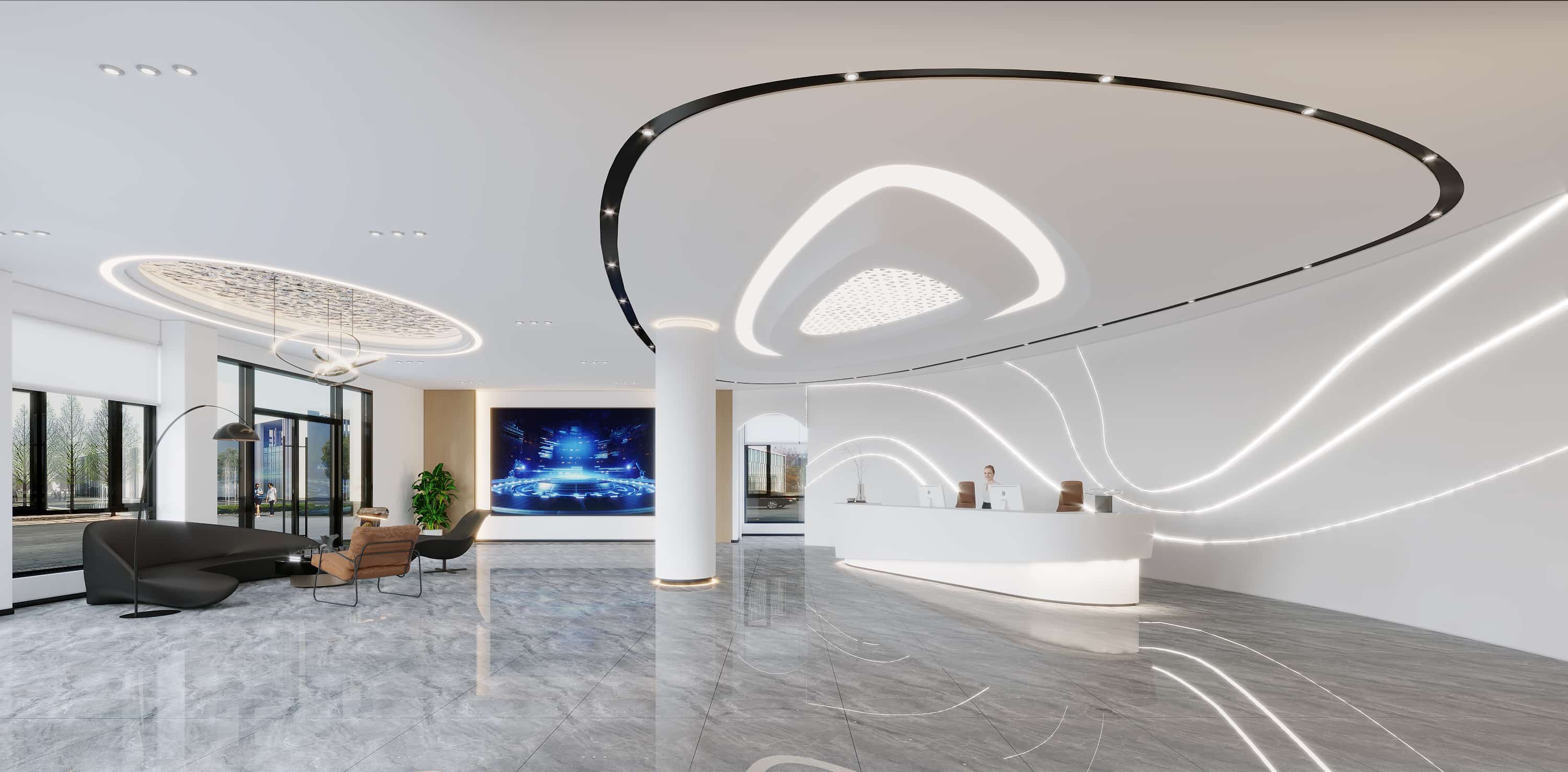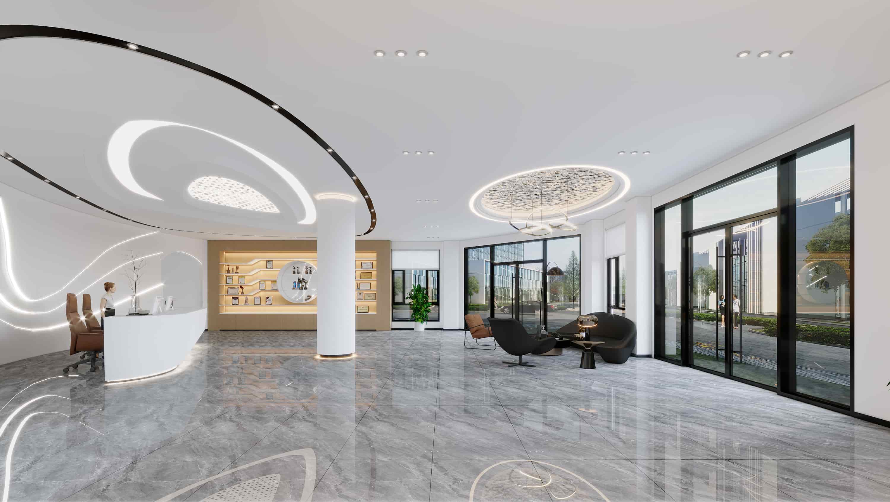 大廳:以白色為主色調(diào),搭配灰色大理石地面,營造出簡潔大氣的氛圍。天花板上獨(dú)特的弧形燈帶設(shè)計,線條流暢,宛如藝術(shù)裝置,增添了空間的科技感與靈動性。圓形吊燈精致美觀,與整體風(fēng)格相得益彰。大面積的落地窗引入充足自然光線,使空間更加明亮通透。接待臺造型簡約現(xiàn)代,白色外觀干凈利落,后方的展示墻可用于陳列企業(yè)榮譽(yù)或產(chǎn)品,提升企業(yè)形象。休息區(qū)的黑色沙發(fā)與棕色座椅,為來訪者提供了舒適的等候空間。