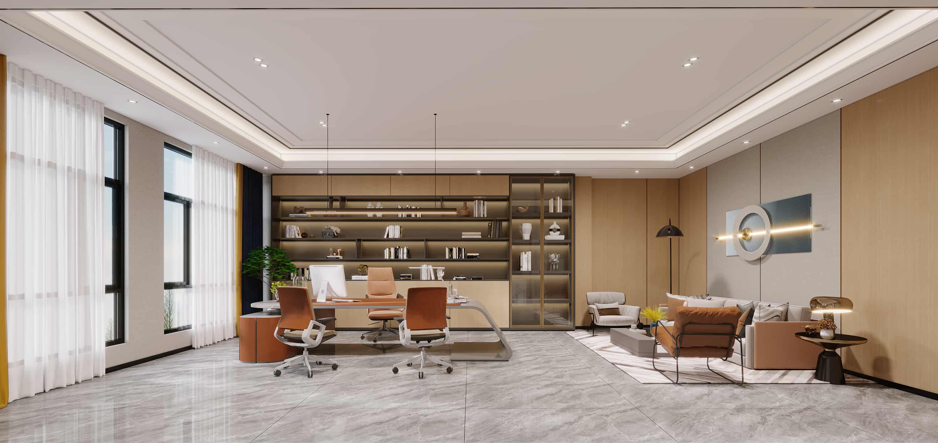 辦公室:采用米色與白色相結(jié)合的色調(diào),營造出溫馨舒適的辦公環(huán)境。墻面的米色護(hù)墻板與地面的灰色大理石形成和諧搭配,天花板的燈帶設(shè)計簡潔大方,提供了充足的照明。辦公桌椅造型現(xiàn)代,色彩與整體空間相呼應(yīng),書架上的書籍和裝飾品增添了文化氣息與生活質(zhì)感。窗邊的窗簾可調(diào)節(jié)光線,保證辦公環(huán)境的舒適性。