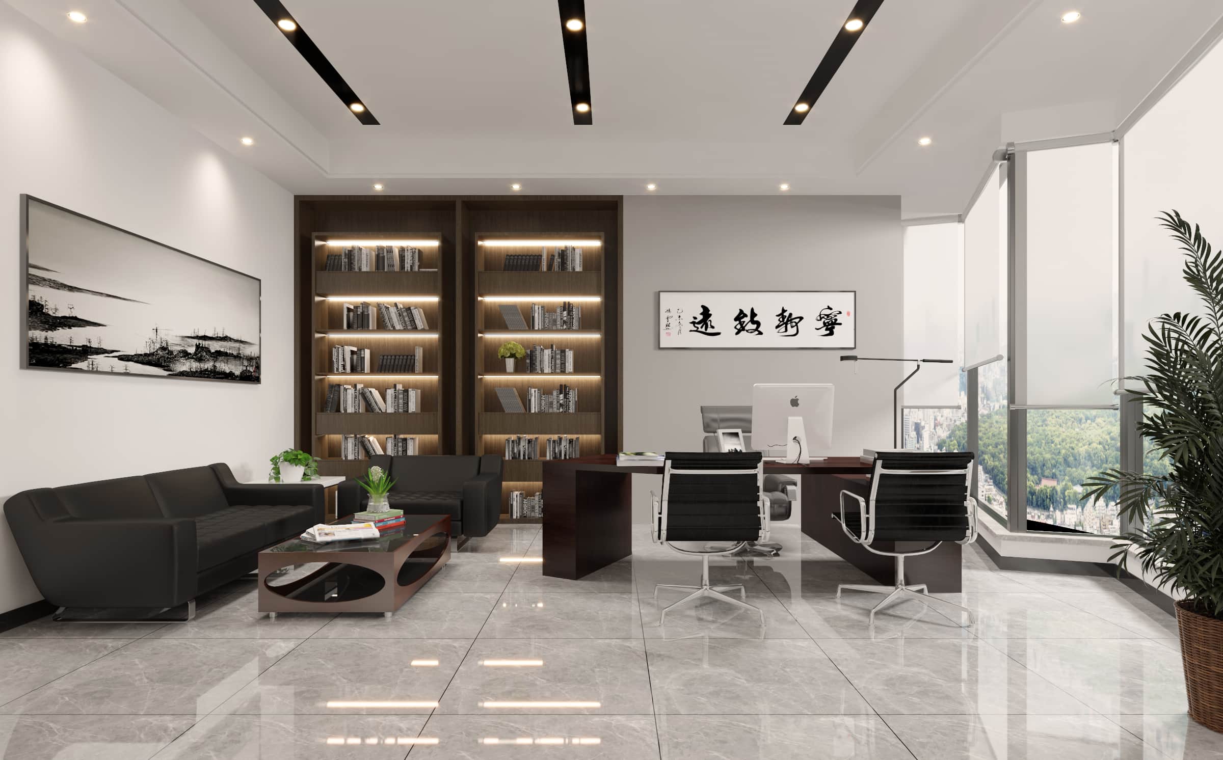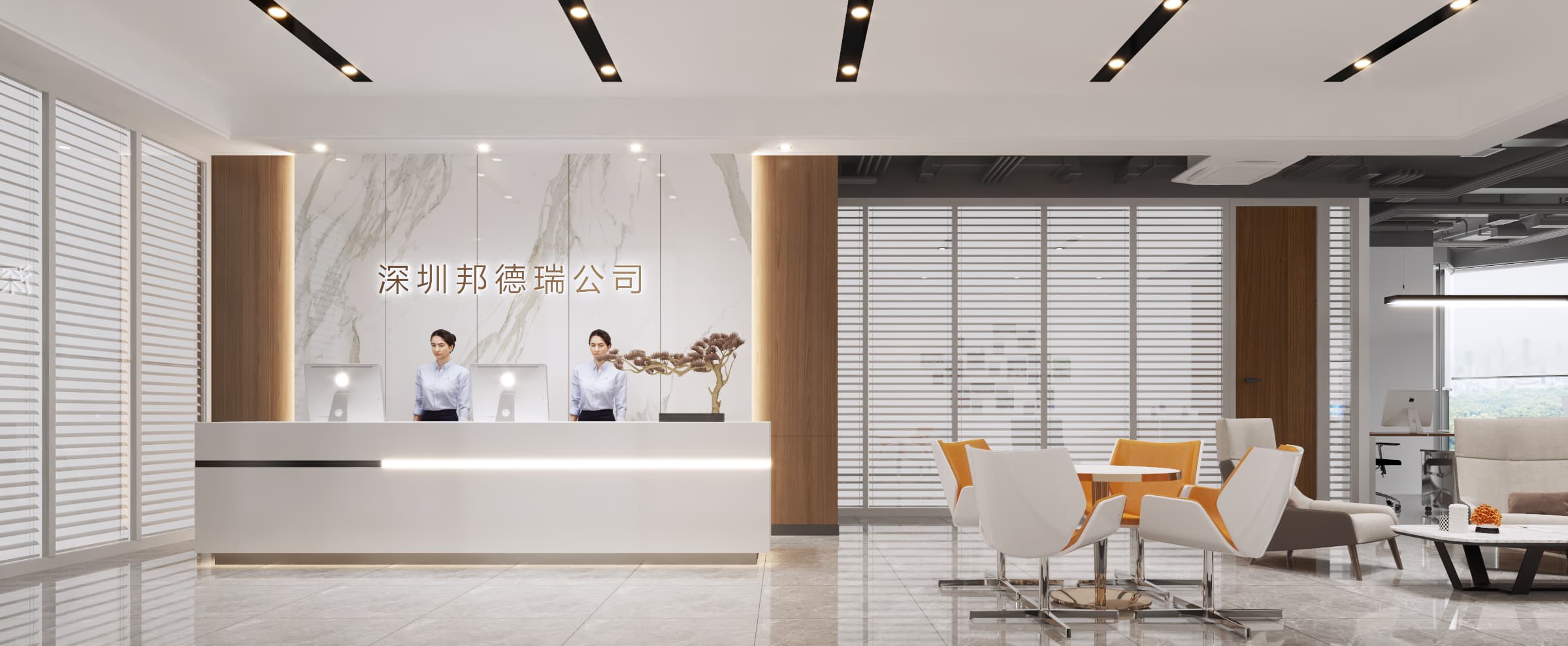 前臺區(qū)域,大理石墻面搭配木質(zhì)元素,彰顯大氣與質(zhì)感,簡潔的接待臺與柔和燈光,營造專業(yè)氛圍。辦公區(qū)以白色為主調(diào),寬敞明亮,大面積窗戶引入自然光線,視野開闊。經(jīng)理辦公室內(nèi),深色家具與書架增添穩(wěn)重感,墻上字畫點(diǎn)綴文化氣息,綠植生機(jī)盎然,緩解視覺疲勞。各處燈光設(shè)計考究,既保證照明又烘托氛圍,旨在打造一個舒適、高效且富有格調(diào)的辦公環(huán)境,展現(xiàn)公司的專業(yè)形象與文化內(nèi)涵。