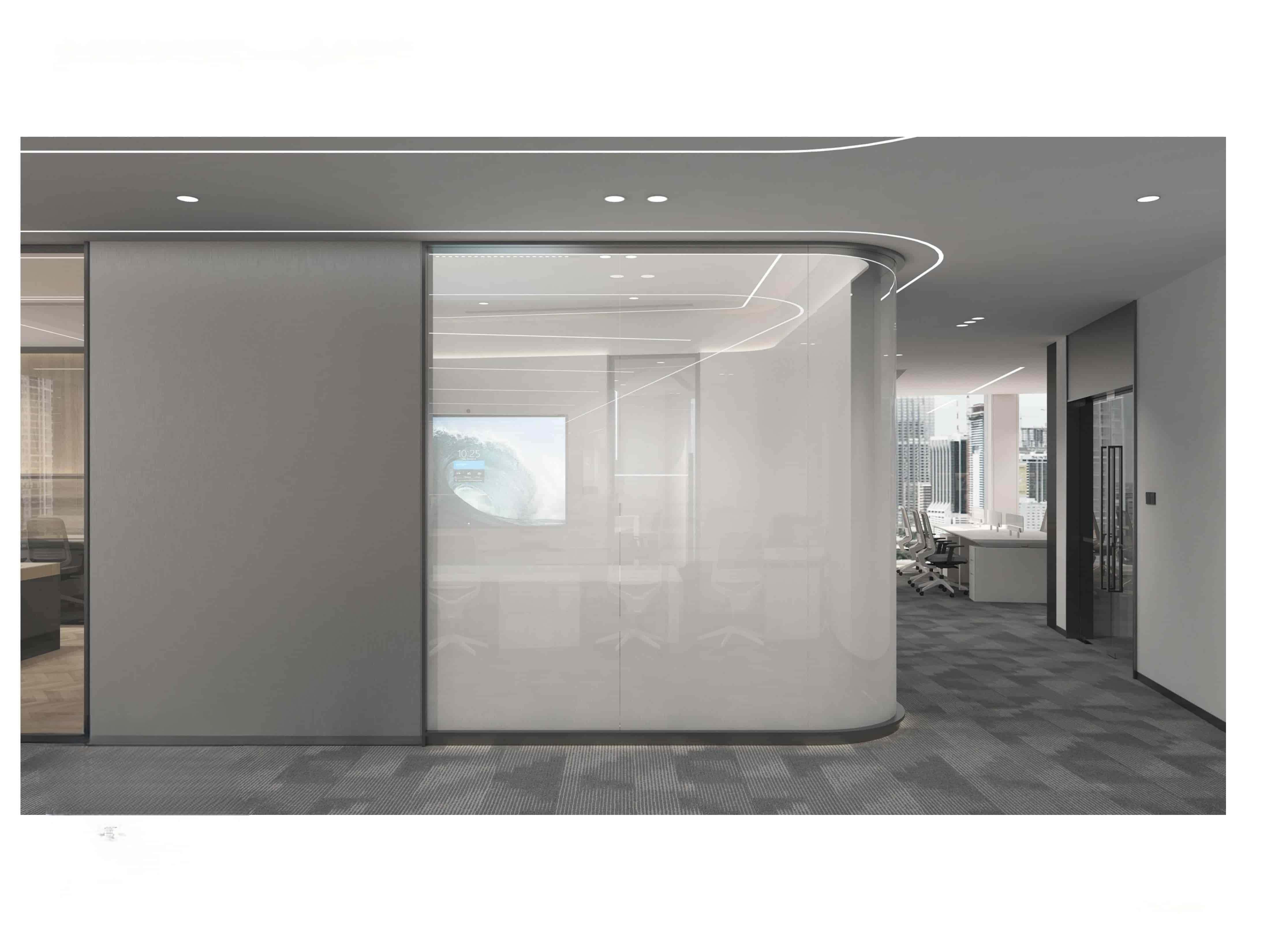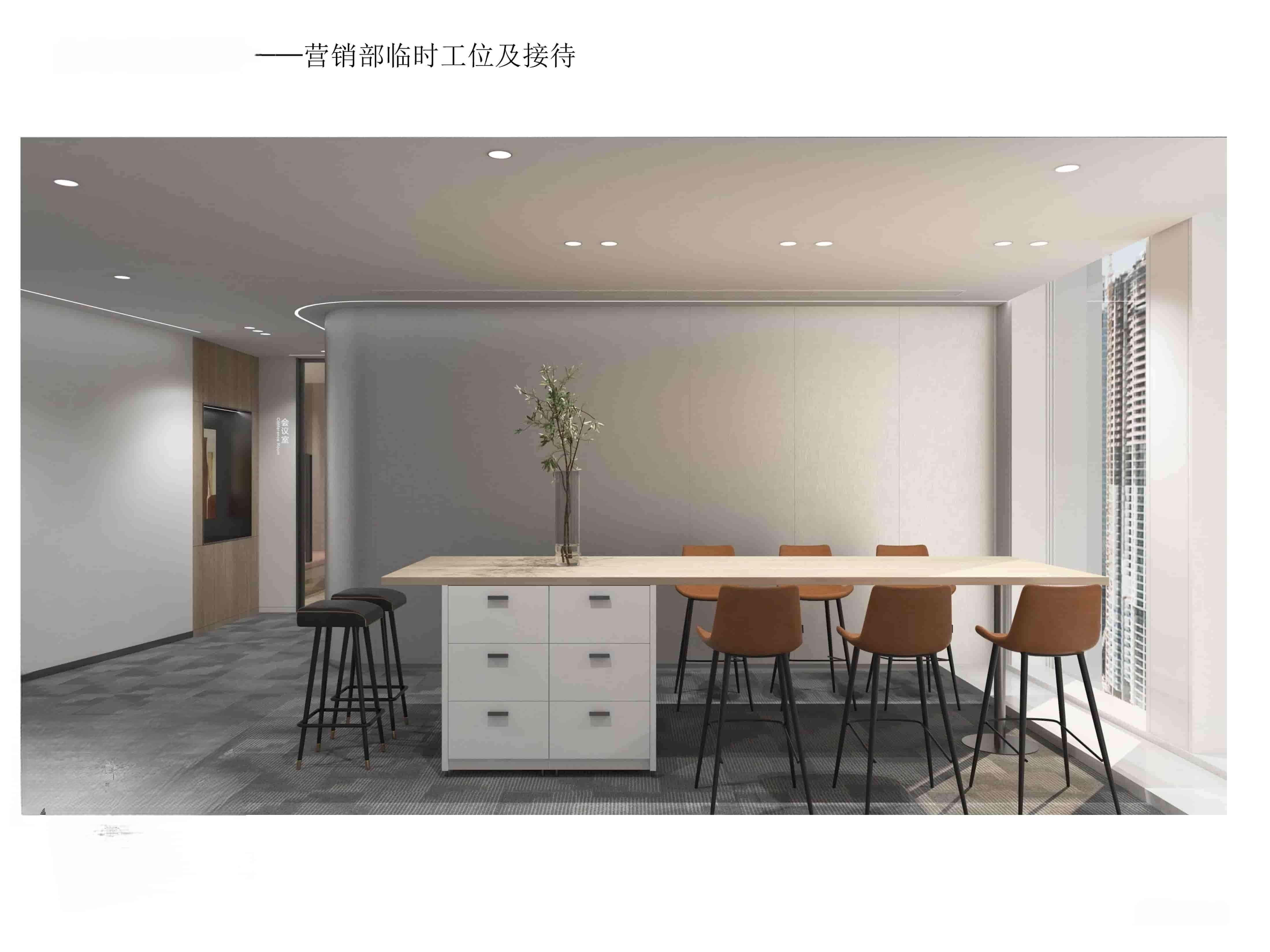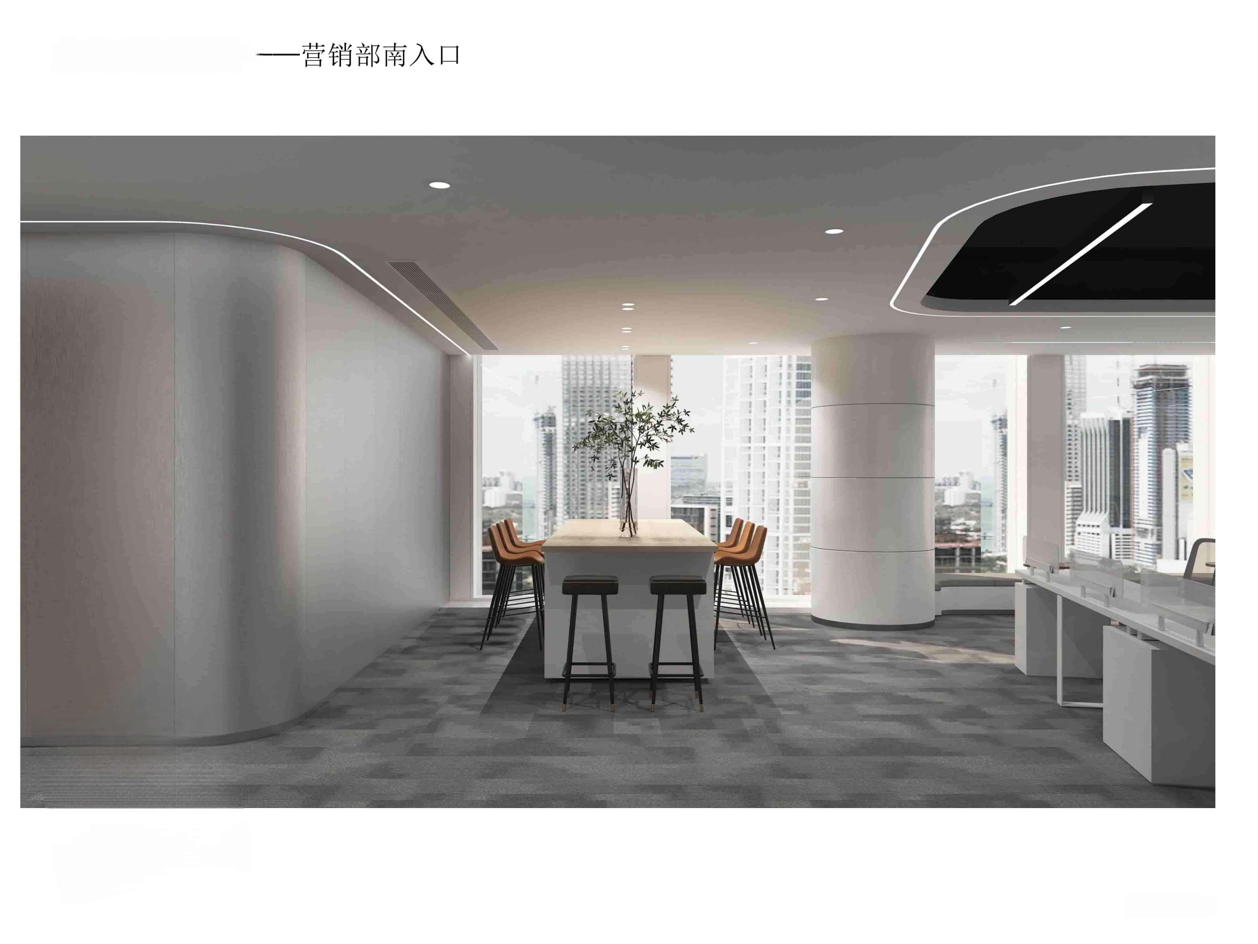 本設計為公司辦公區(qū)域,整體風格簡約現(xiàn)代。營銷部以白色為主色調(diào),搭配灰色地毯,營造簡潔明亮氛圍。大面積辦公桌椅滿足多人辦公需求,天花板獨特的黑色區(qū)域與白色燈帶設計,增添空間層次感與科技感。南入口處設置長桌與舒適座椅,兼具臨時工位與接待功能,窗外城市景觀引入自然光線與開闊視野。臨時工位及接待區(qū)同樣簡潔實用,綠植點綴增添生機與活力。材質(zhì)選用環(huán)保耐用,燈光設計柔和明亮,旨在打造一個舒適、高效且富有活力的辦公環(huán)境,提升員工工作體驗與企業(yè)形象。