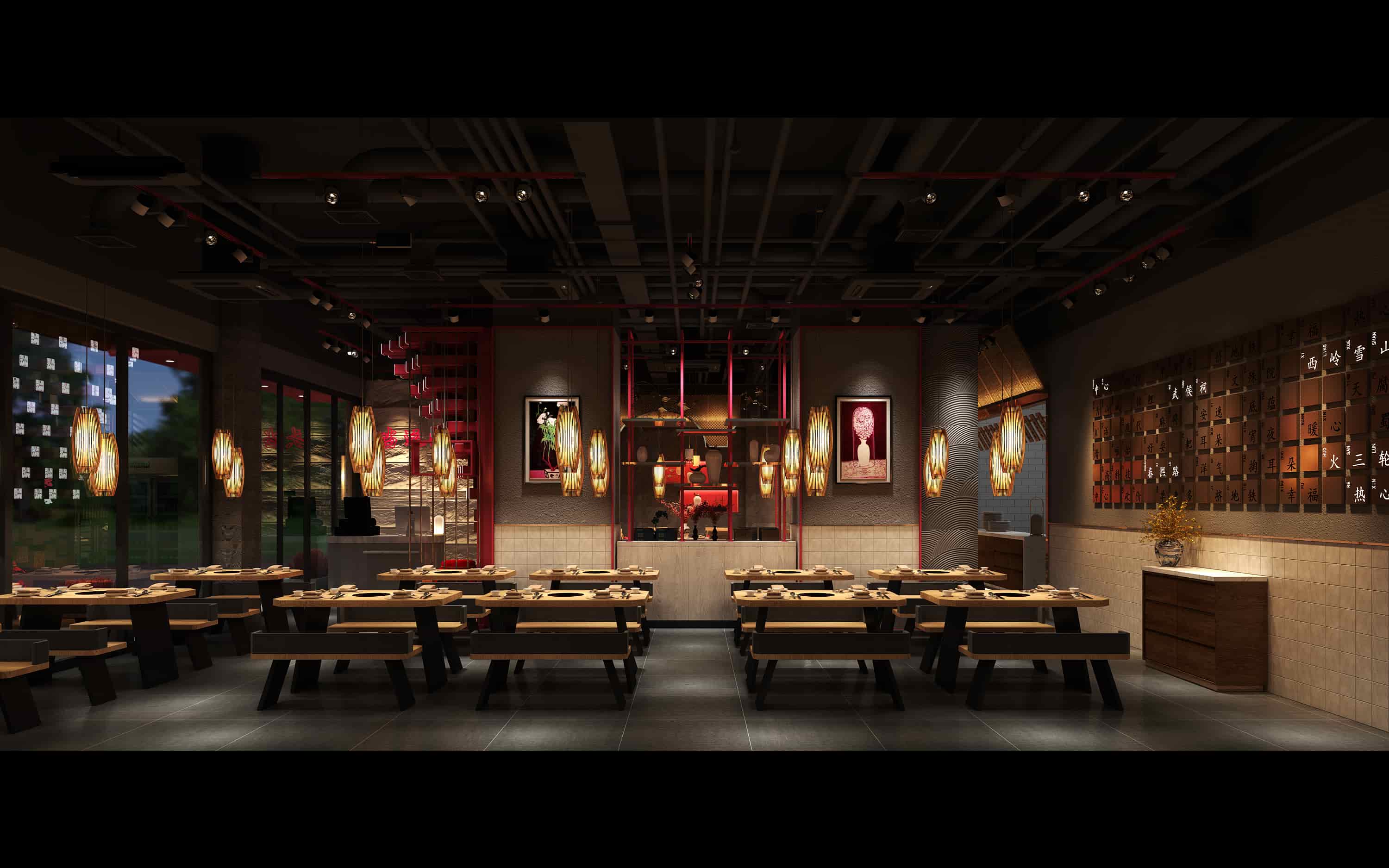 合理的桌椅布局,既保證了空間的寬敞,又能滿足多人聚餐需求。整體設(shè)計(jì)通過對(duì)色彩、材質(zhì)與燈光的巧妙運(yùn)用,打造出一個(gè)舒適且富有特色的火鍋餐廳,讓顧客在享受美食的同時(shí),也能感受到獨(dú)特的文化氛圍與用餐體驗(yàn)。