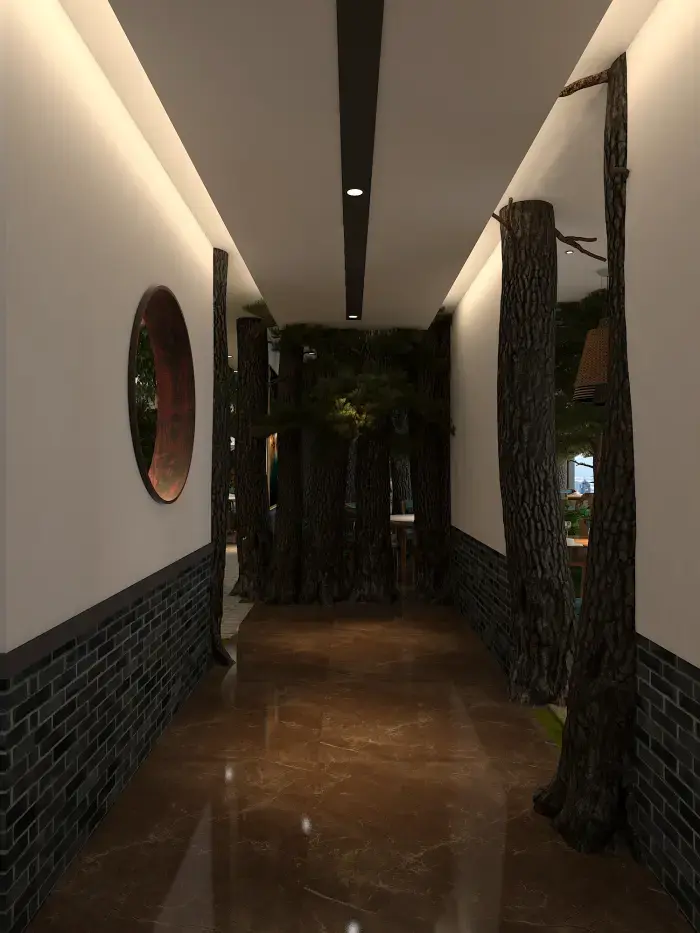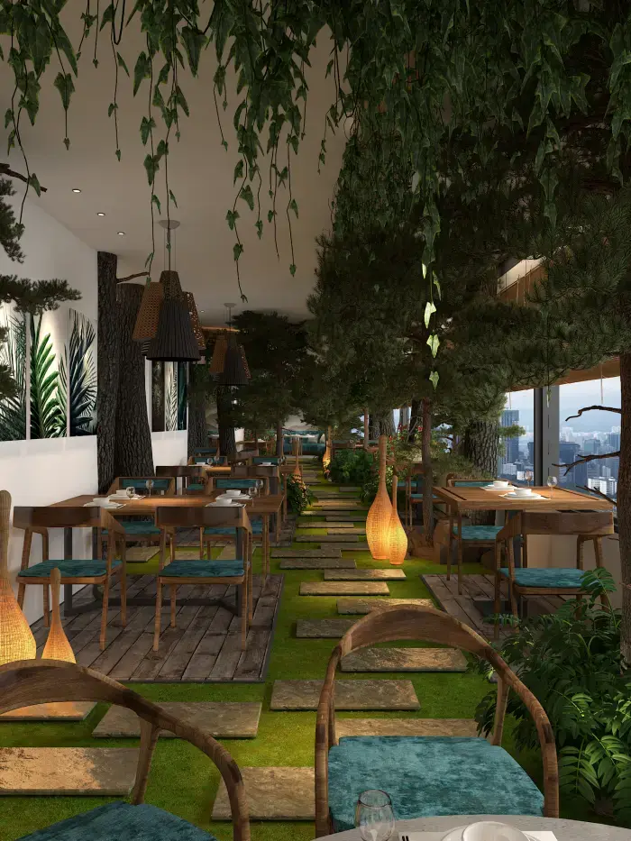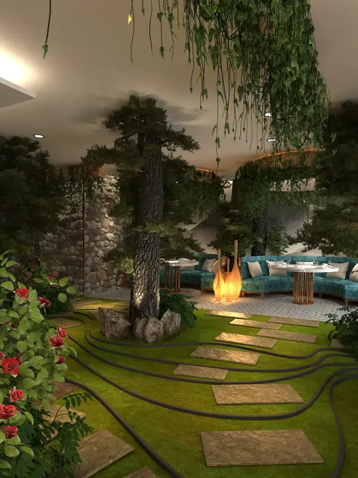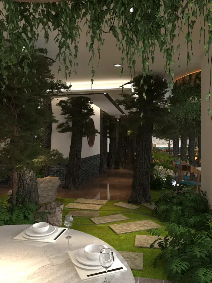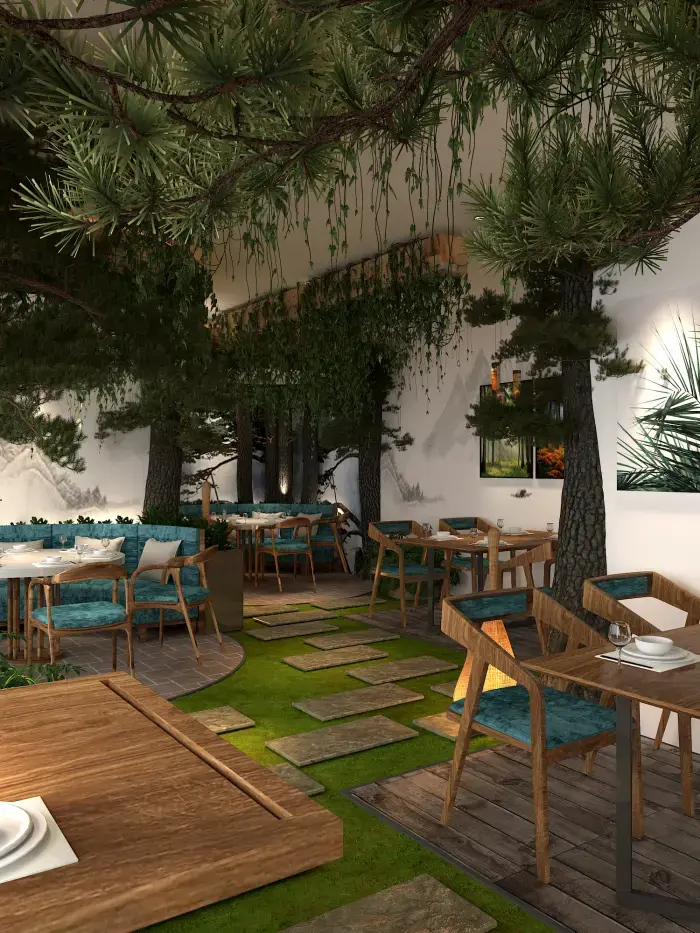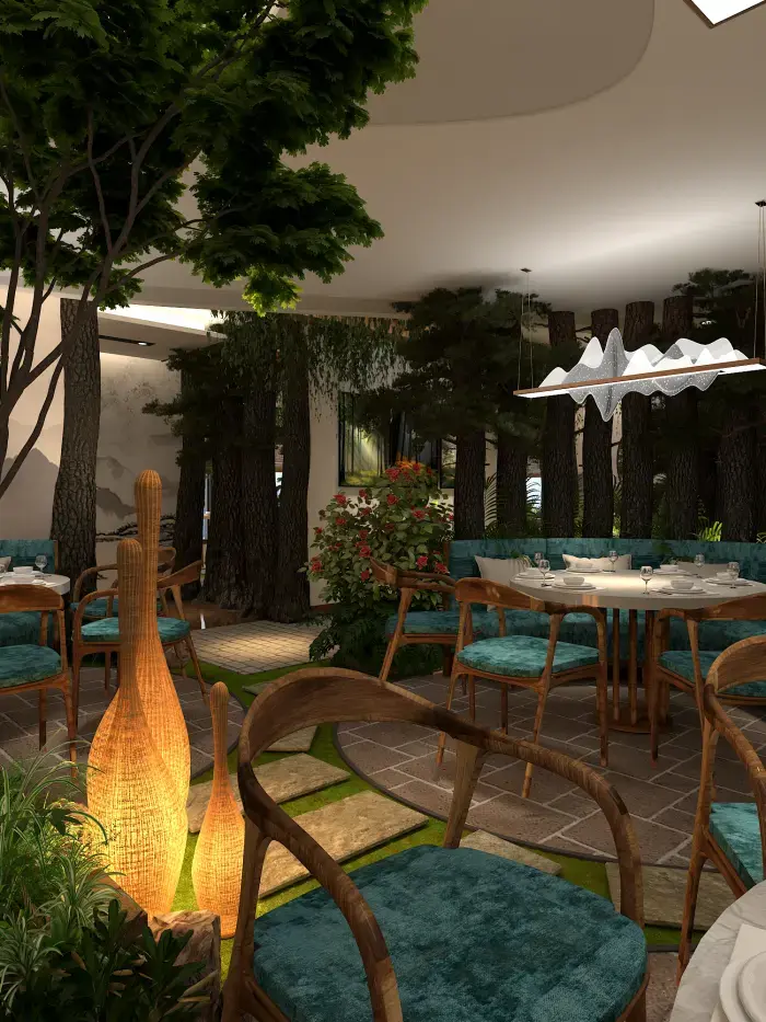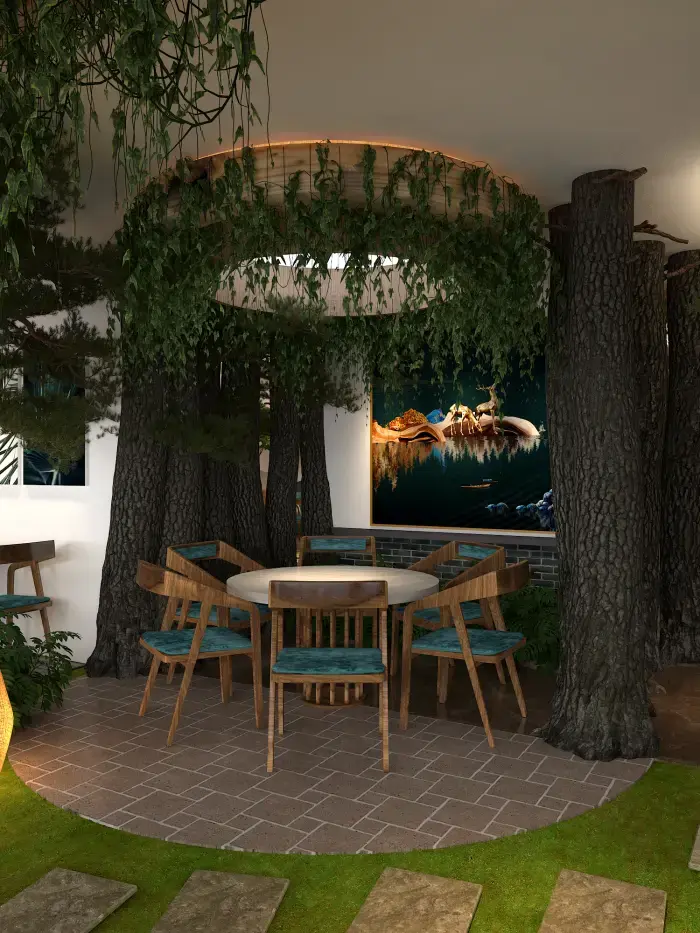 空間內(nèi)大量運(yùn)用仿真樹(shù)木、綠植與山石,營(yíng)造出濃郁的森林氛圍。地面鋪設(shè)草坪與石板路,仿佛置身林間小徑。桌椅選用木質(zhì)材質(zhì),搭配藍(lán)綠色坐墊,清新自然。墻壁上的山水畫(huà)作與植物裝飾畫(huà),進(jìn)一步強(qiáng)化了自然主題。