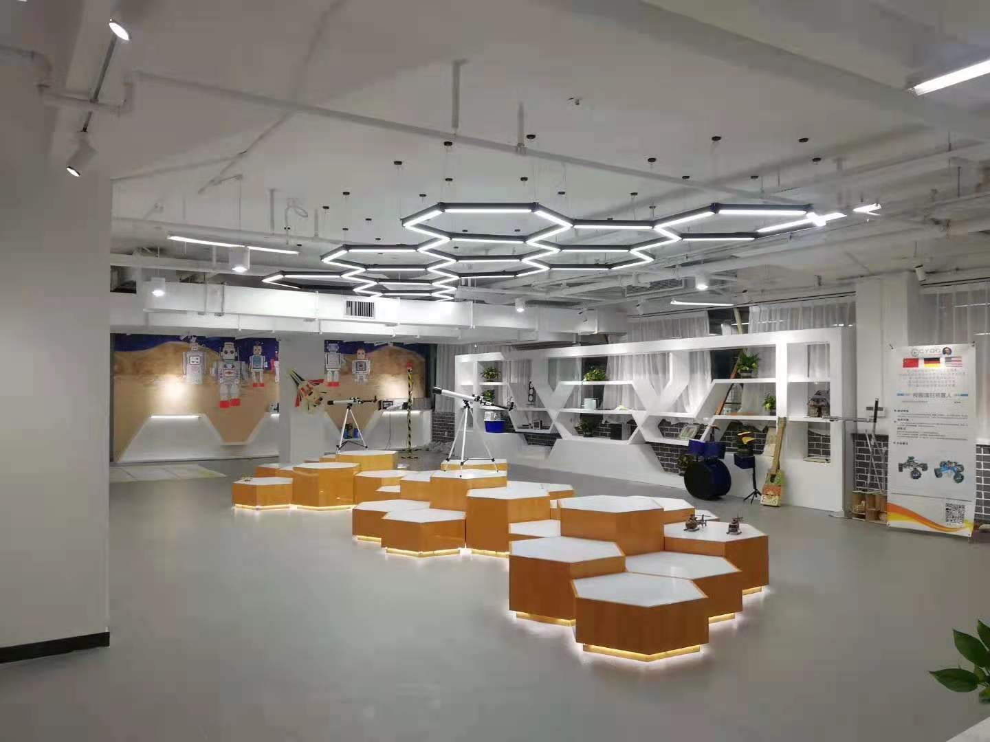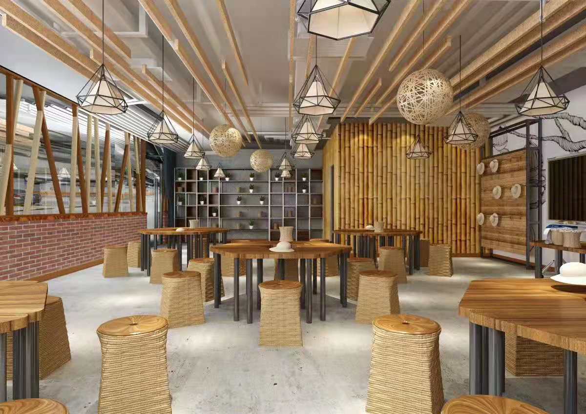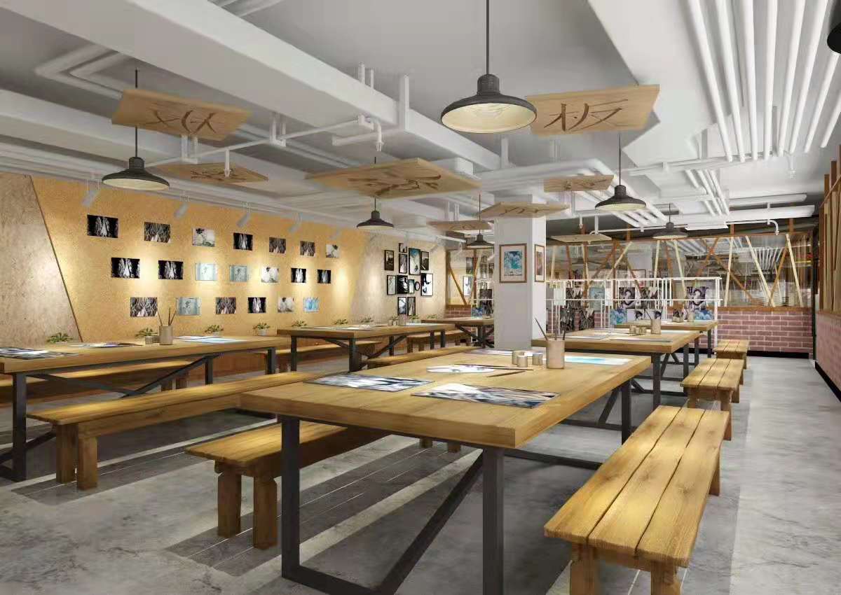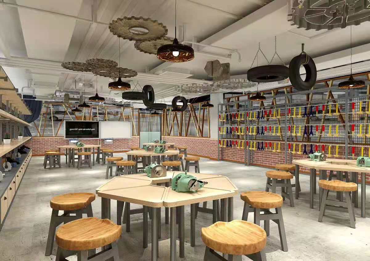 本設(shè)計旨在打造多元且富有創(chuàng)意的空間環(huán)境。色彩繽紛的空間,以彩虹色裝飾天花板,搭配木質(zhì)桌椅,營造出活潑歡快的氛圍,適合創(chuàng)意手工等活動。工業(yè)風(fēng)空間,齒輪、輪胎等元素與紅磚墻面結(jié)合,展現(xiàn)獨特個性,可作為機(jī)械操作或手工坊。竹制元素空間,散發(fā)自然氣息,讓人放松,適合休閑交流。藝術(shù)展示空間,墻面照片與特色燈具烘托氛圍,利于作品展示與欣賞。休閑區(qū)則以舒適沙發(fā)、柔和燈光打造愜意角落。整體設(shè)計風(fēng)格多樣,功能豐富,滿足不同需求與體驗。