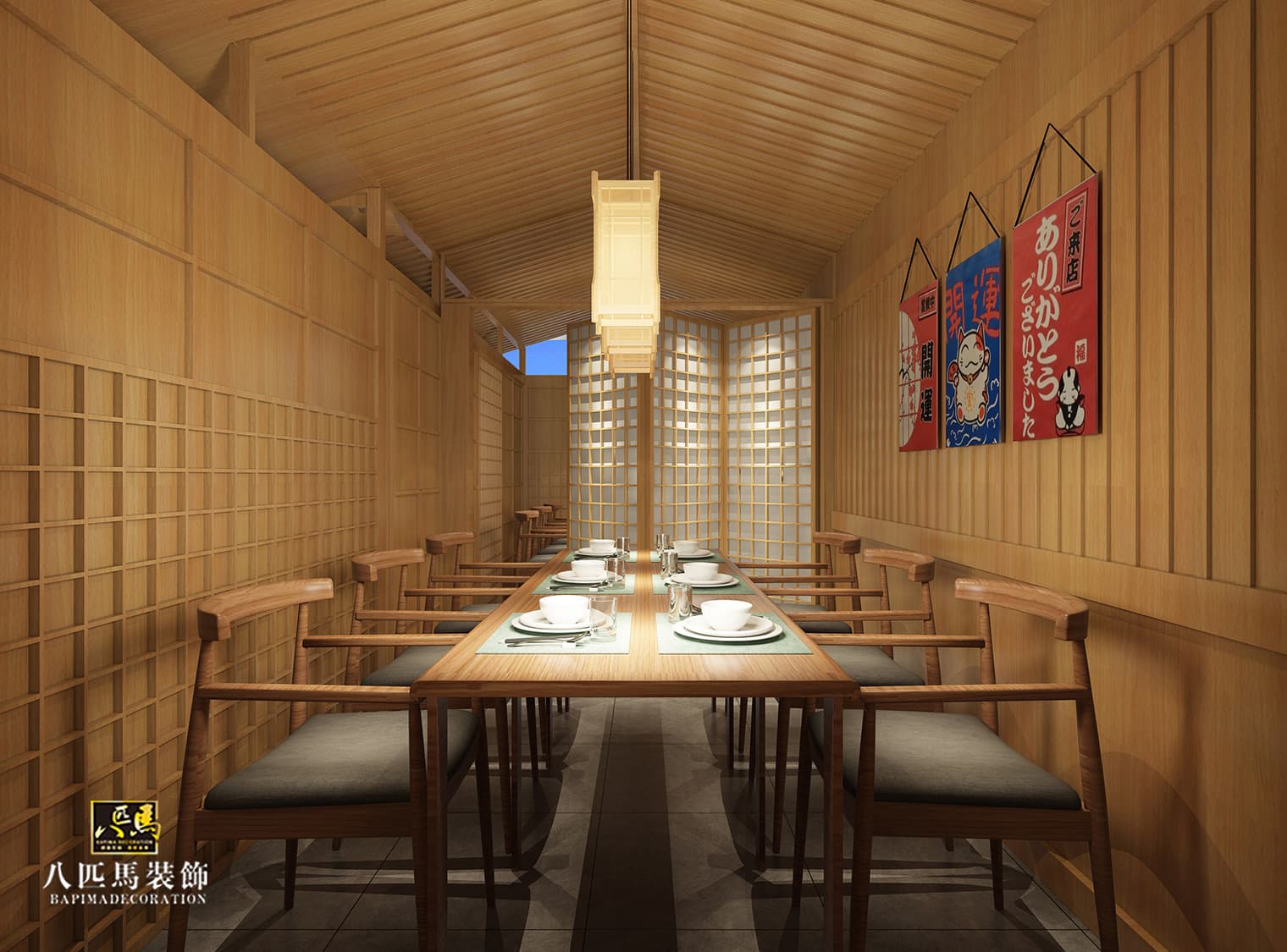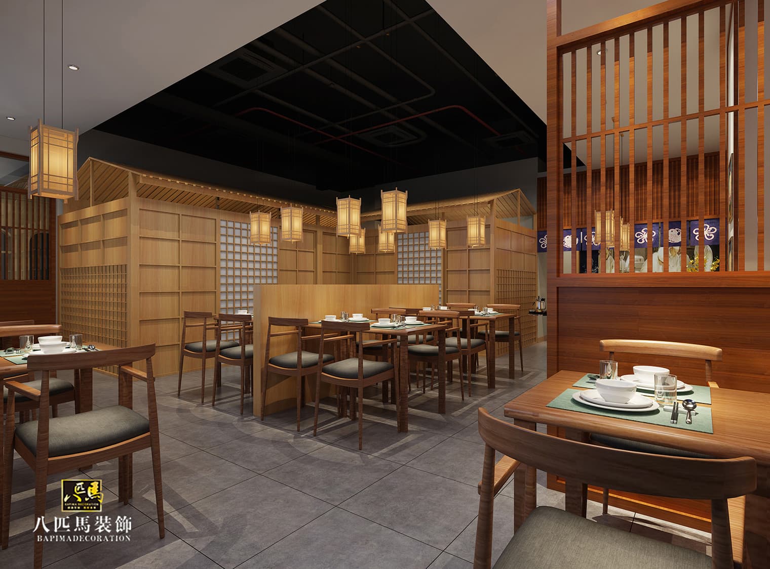 讓整個(gè)設(shè)計(jì)空間制造出寧?kù)o的視覺效果。日式料理店的裝修還講求空間的層次感,巧妙的利用裝飾材料根據(jù)空間使用人數(shù)和私密程度不同,